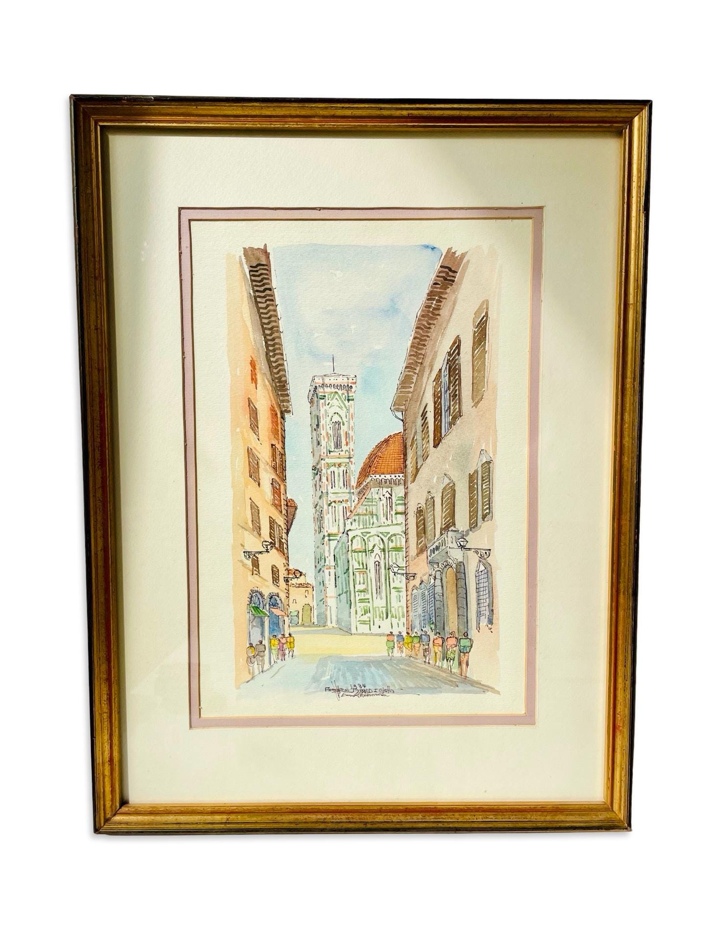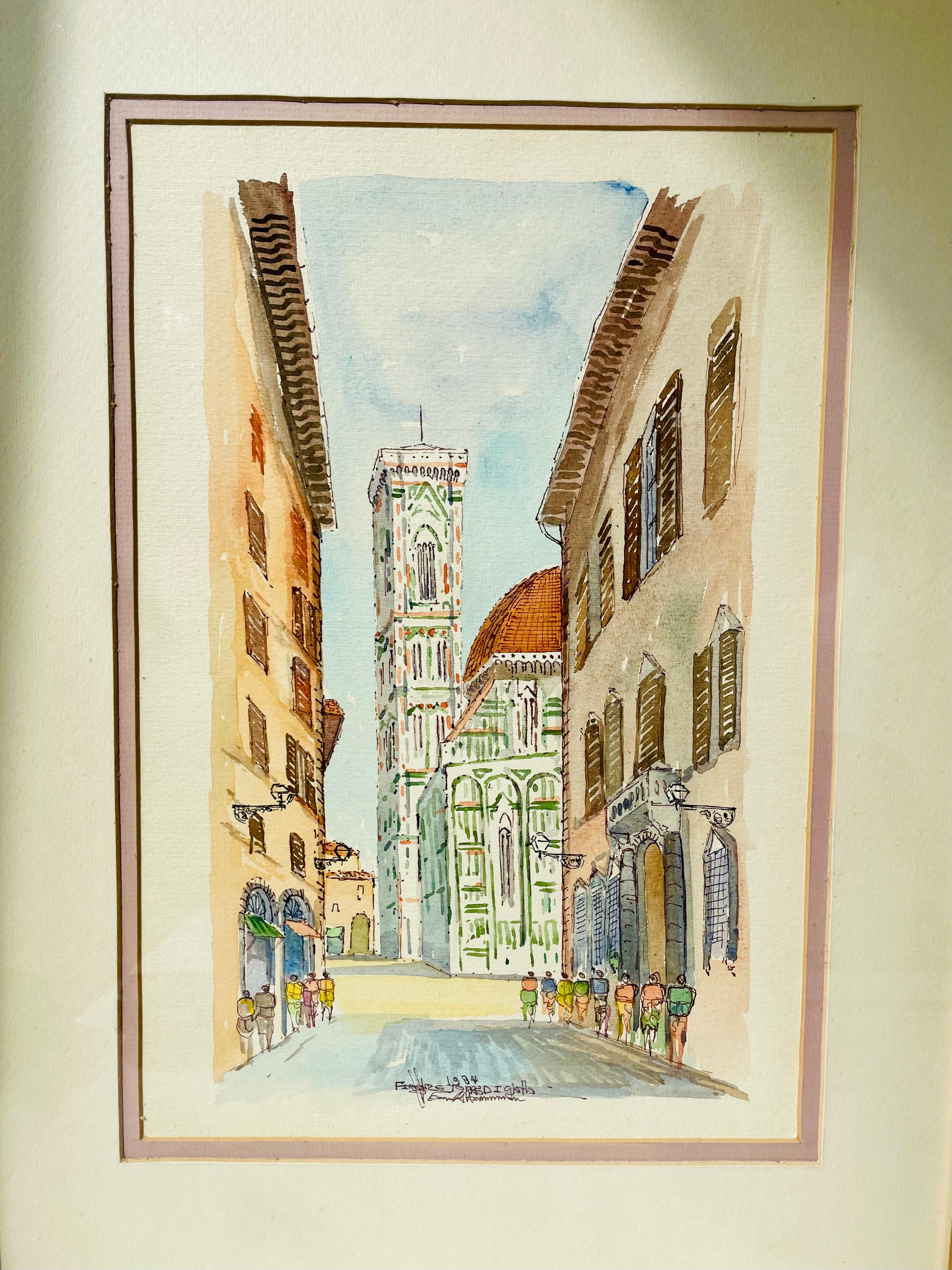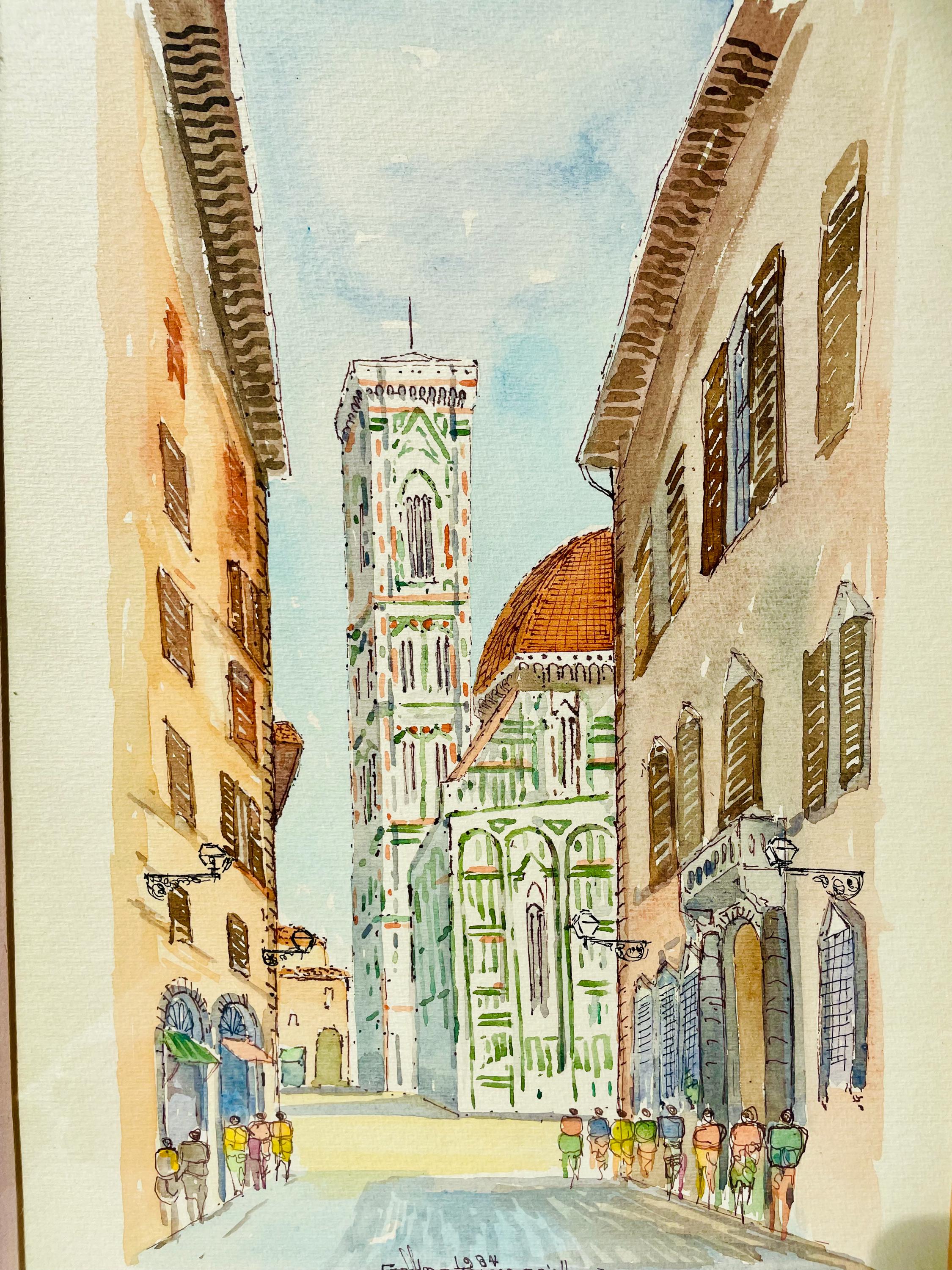 Ti amo! Capture the timeless majesty of Florence with this vintage original ink and watercolor artwork of the Cathedral of Santa Maria del Fiore, lovingly referred to as the Duomo. Signed by the artist, the piece not only beautifully showcases the intricate architecture of the Duomo, but also includes a lively street scene with people, adding a dynamic, everyday touch to this iconic setting. The delicate ink details and soft watercolor tones bring both the grandeur of the cathedral and the charm of the bustling Florentine streets to life. Perfect for admirers of Italian art, architecture, or travel, this painting evokes the charm and history of Florence.