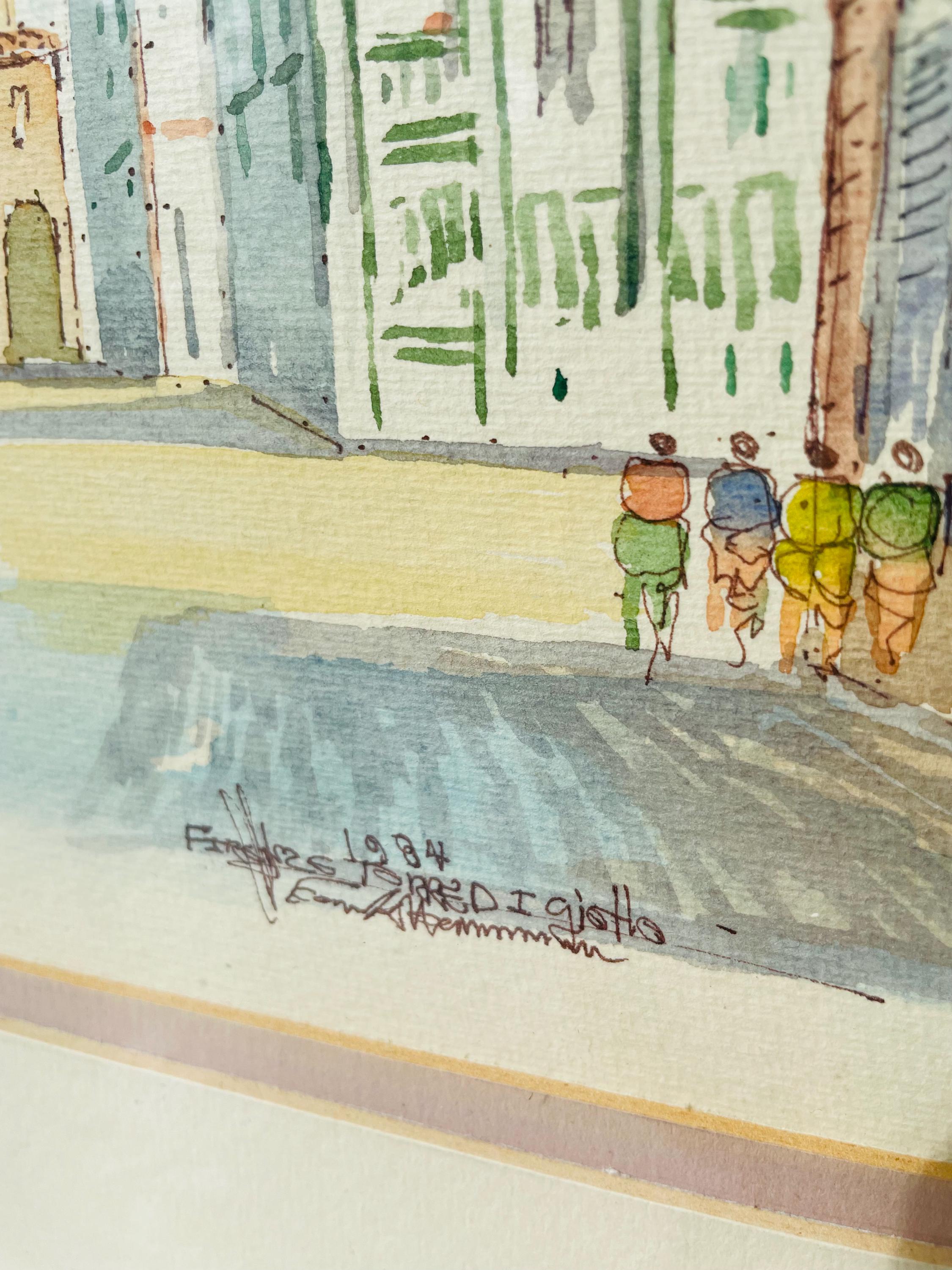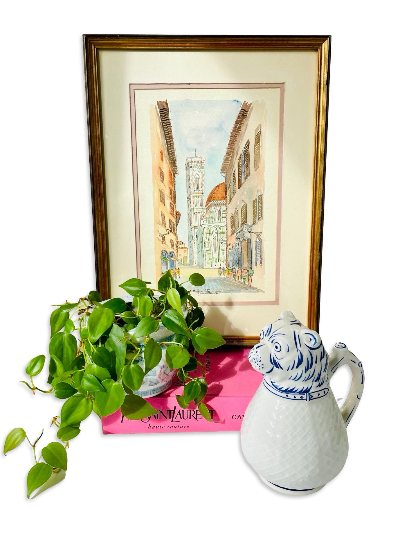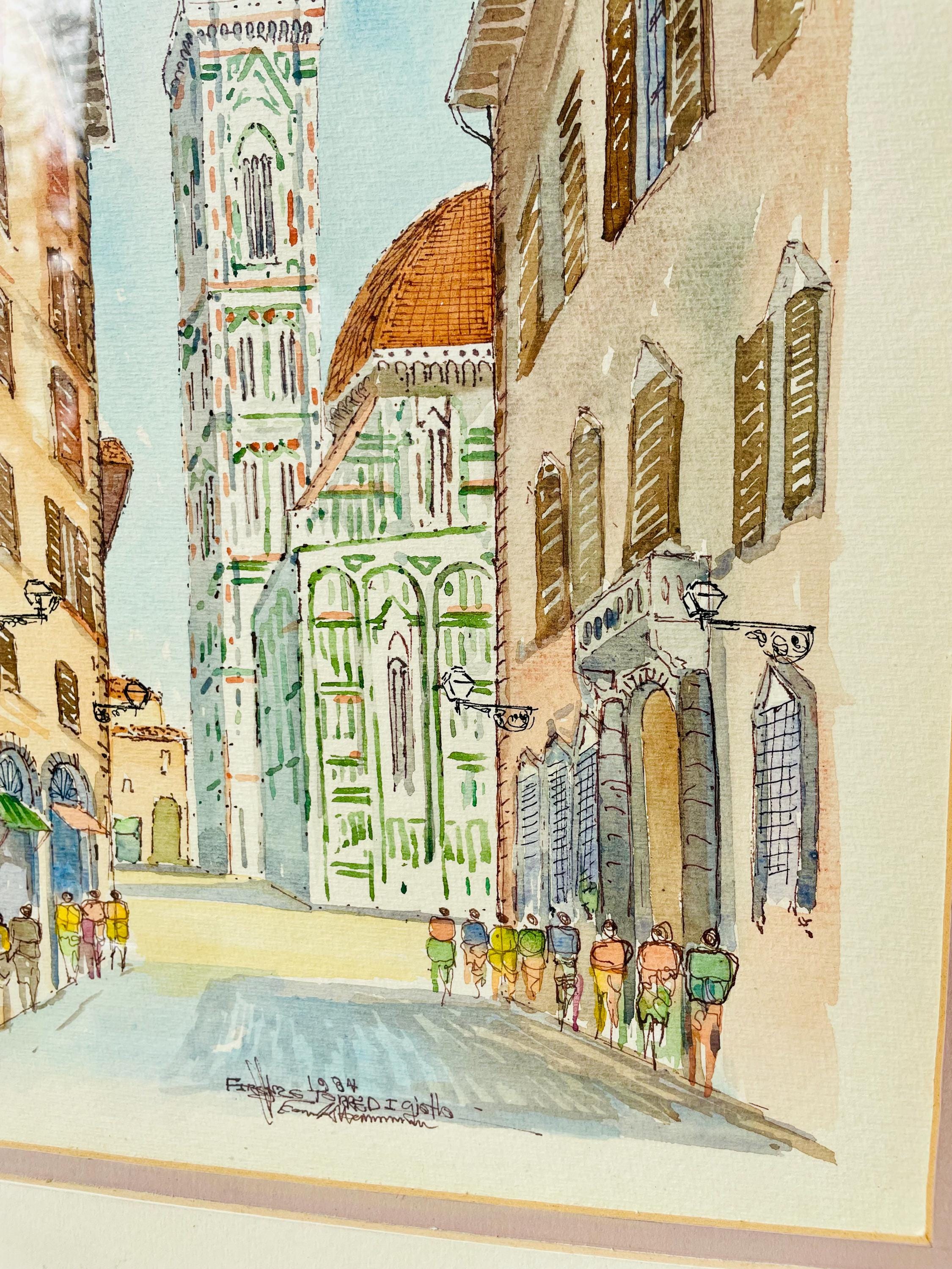 Ti amo! Capture the timeless majesty of Florence with this vintage original ink and watercolor artwork of the Cathedral of Santa Maria del Fiore, lovingly referred to as the Duomo. Signed by the artist, the piece not only beautifully showcases the intricate architecture of the Duomo, but also includes a lively street scene with people, adding a dynamic, everyday touch to this iconic setting. The delicate ink details and soft watercolor tones bring both the grandeur of the cathedral and the charm of the bustling Florentine streets to life. Perfect for admirers of Italian art, architecture, or travel, this painting evokes the charm and history of Florence.