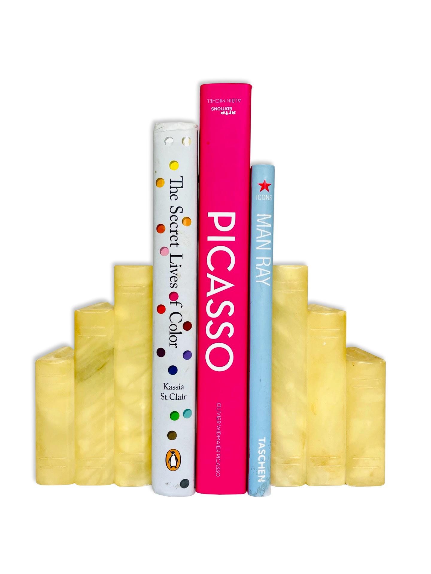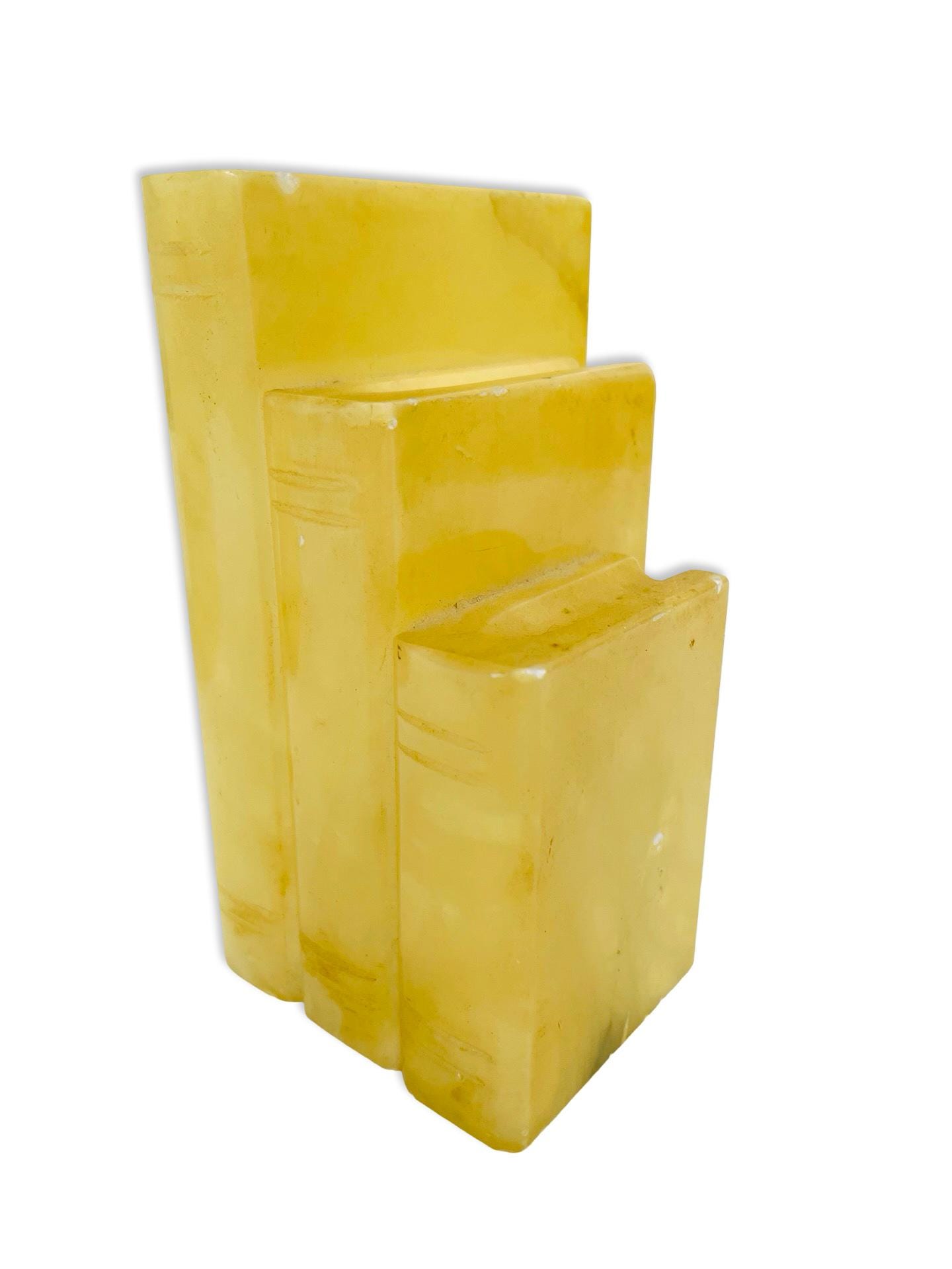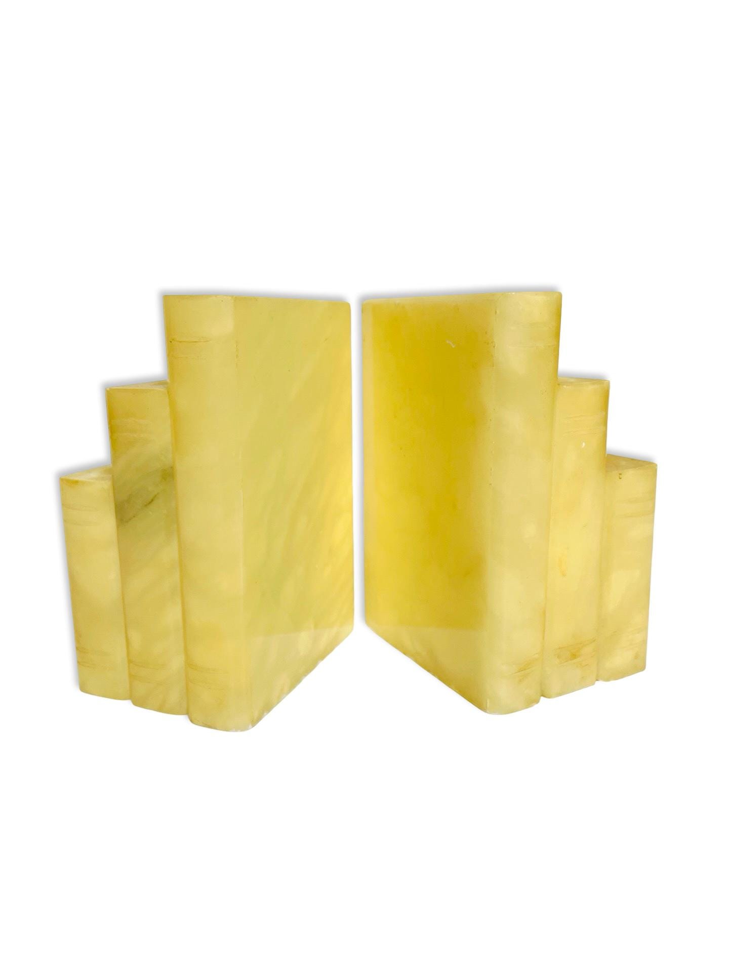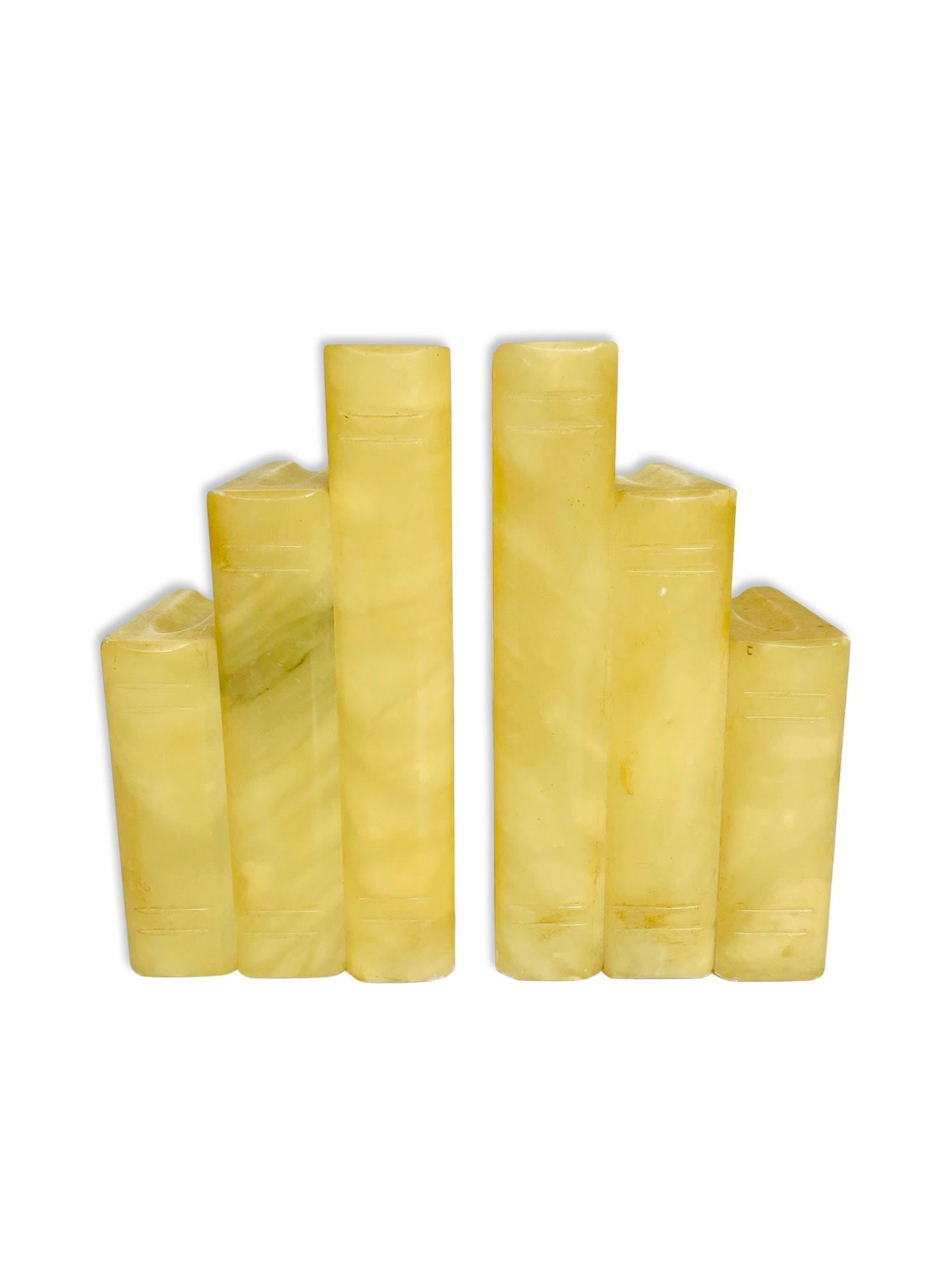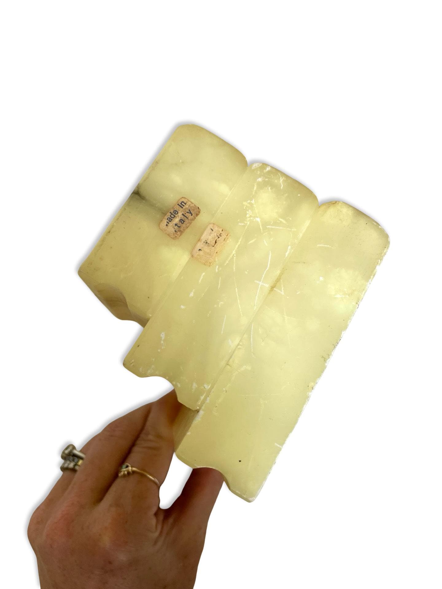 A charming pair of Italian carved alabaster bookends, each sculpted in the form of a classic stacked volume of books. The creamy stone has a soft, luminous quality that highlights the artistry of Italian craftsmanship. With light wear and a few small edge chips from age and use, these bookends carry the kind of character that only vintage pieces can offer. Both practical and decorative, they bring a touch of timeless elegance to any shelf or desk.