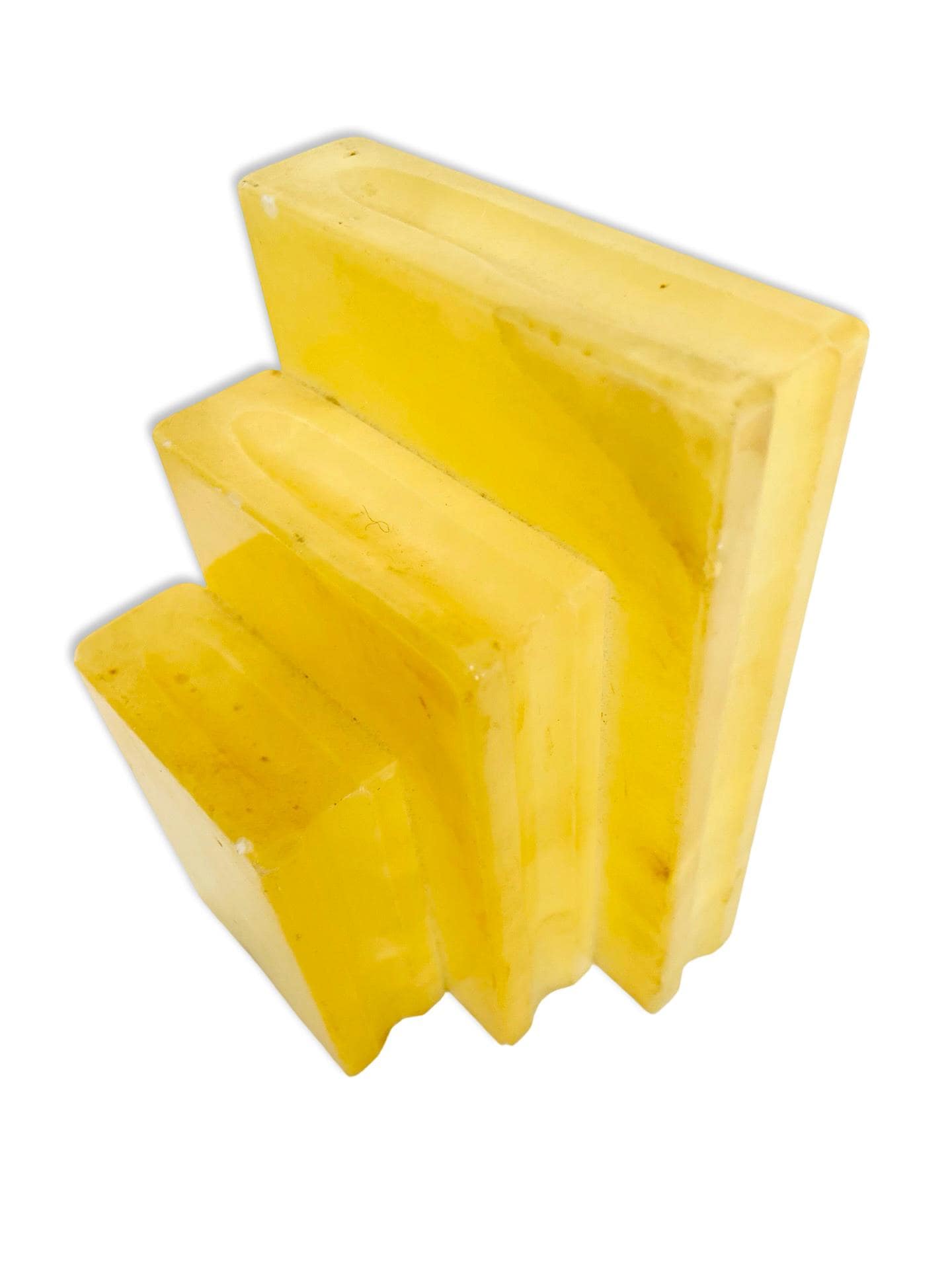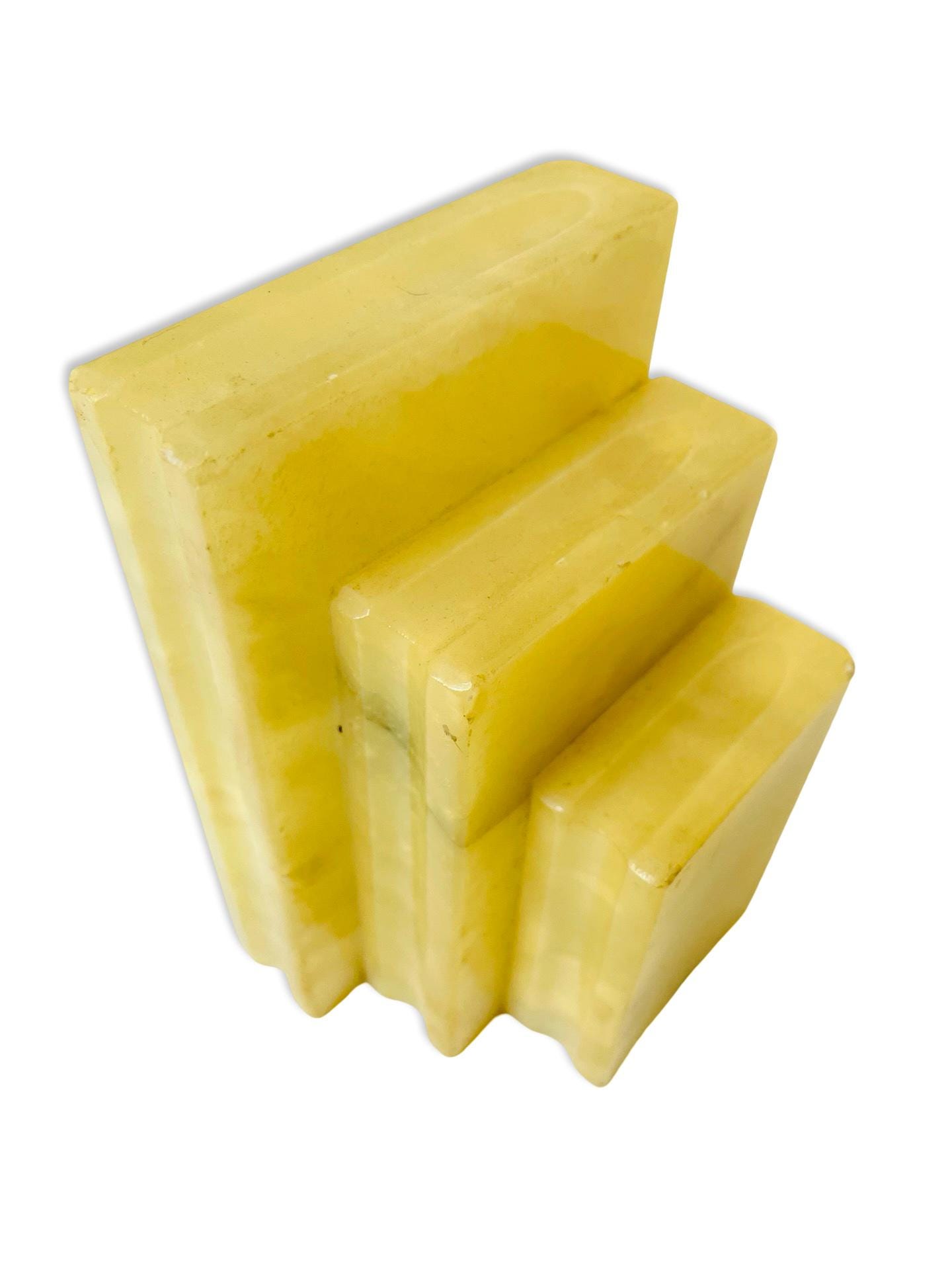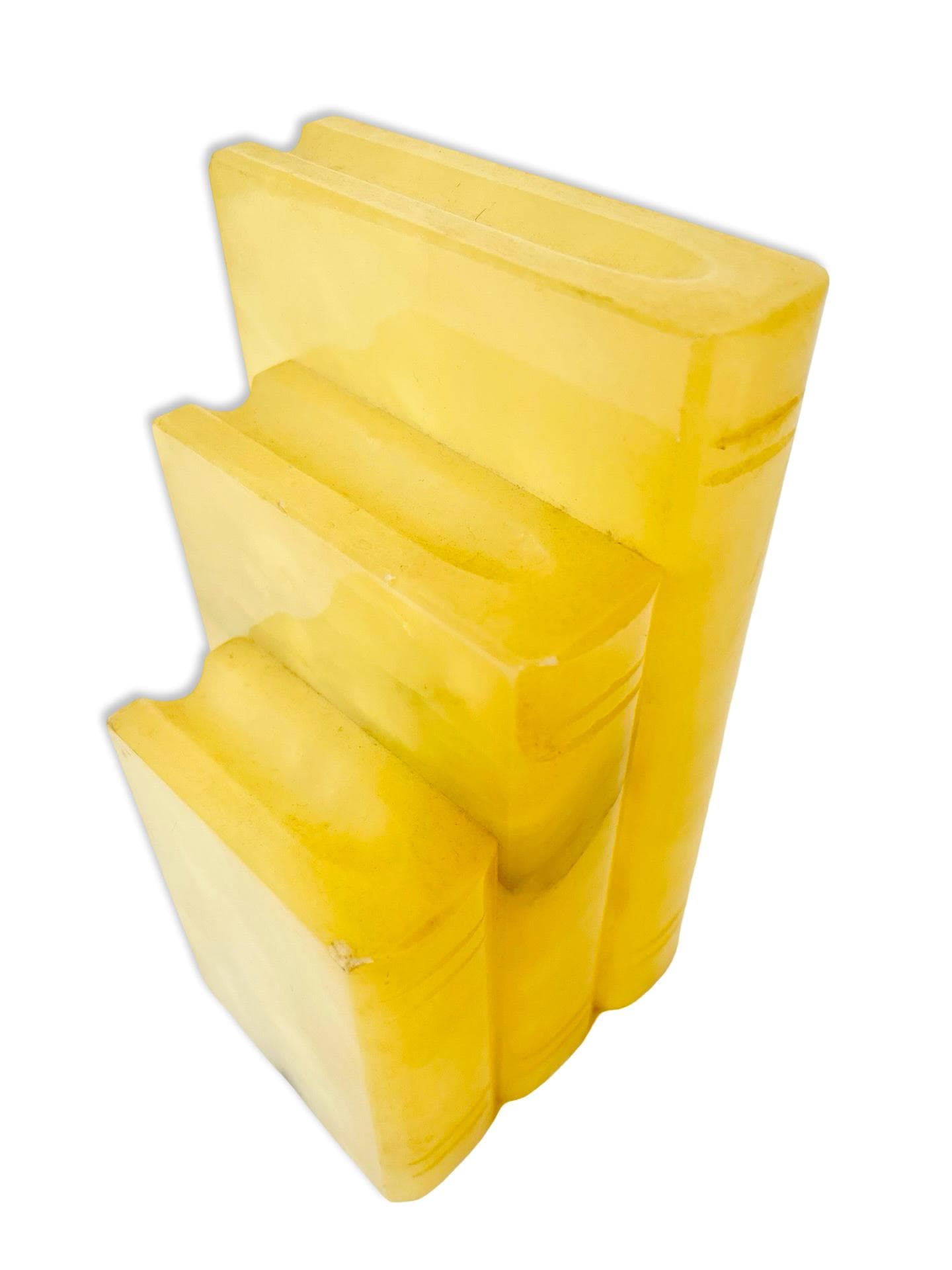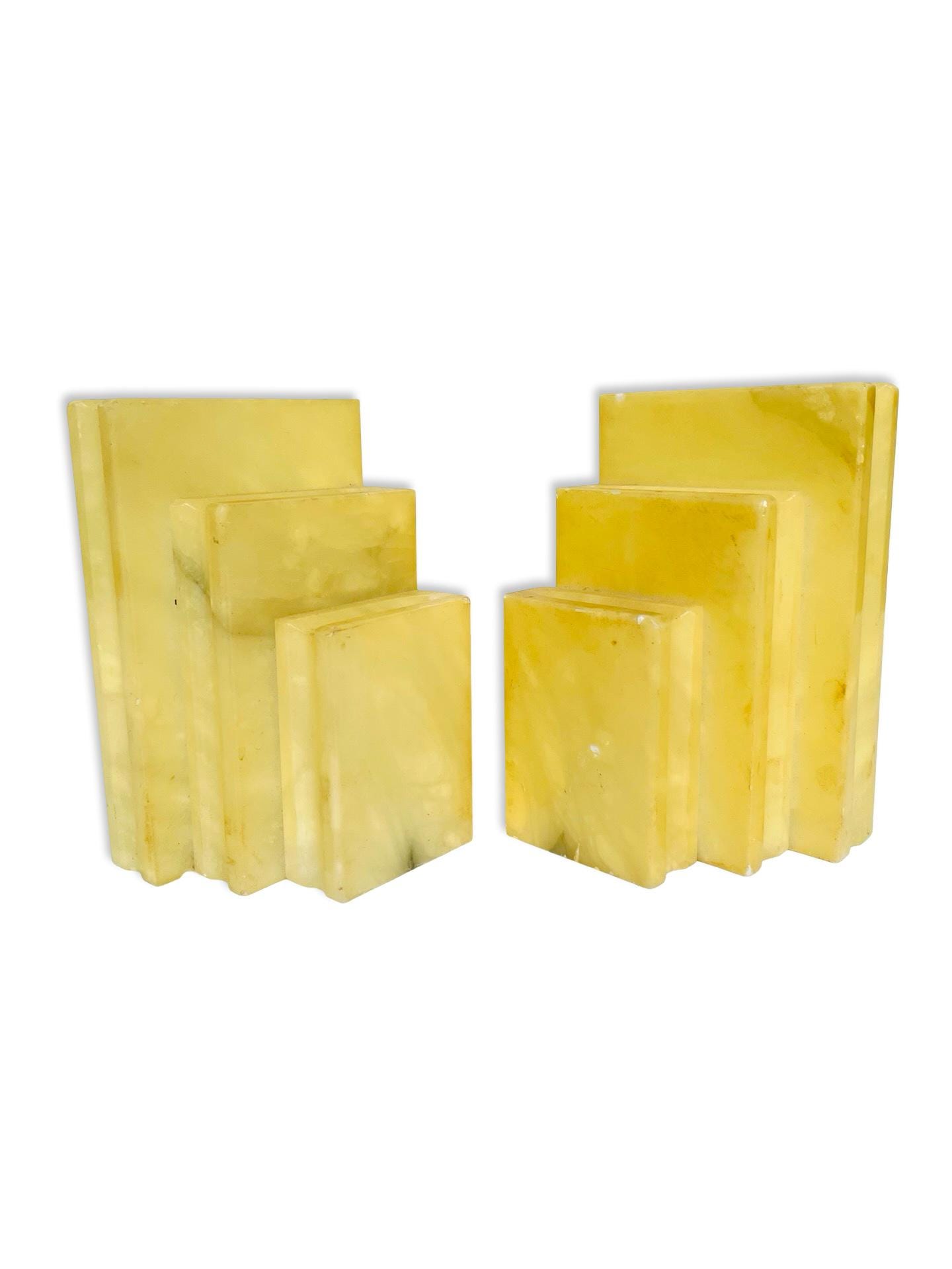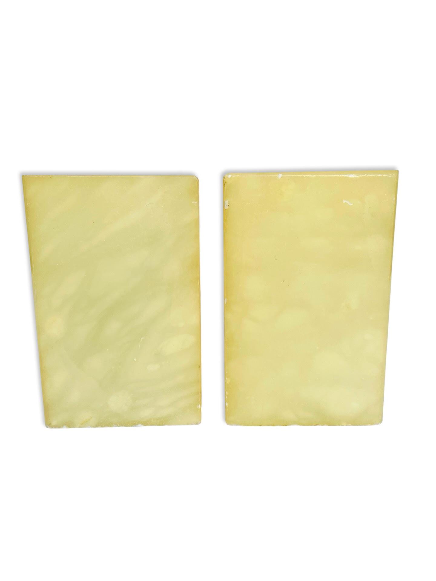 A charming pair of Italian carved alabaster bookends, each sculpted in the form of a classic stacked volume of books. The creamy stone has a soft, luminous quality that highlights the artistry of Italian craftsmanship. With light wear and a few small edge chips from age and use, these bookends carry the kind of character that only vintage pieces can offer. Both practical and decorative, they bring a touch of timeless elegance to any shelf or desk.