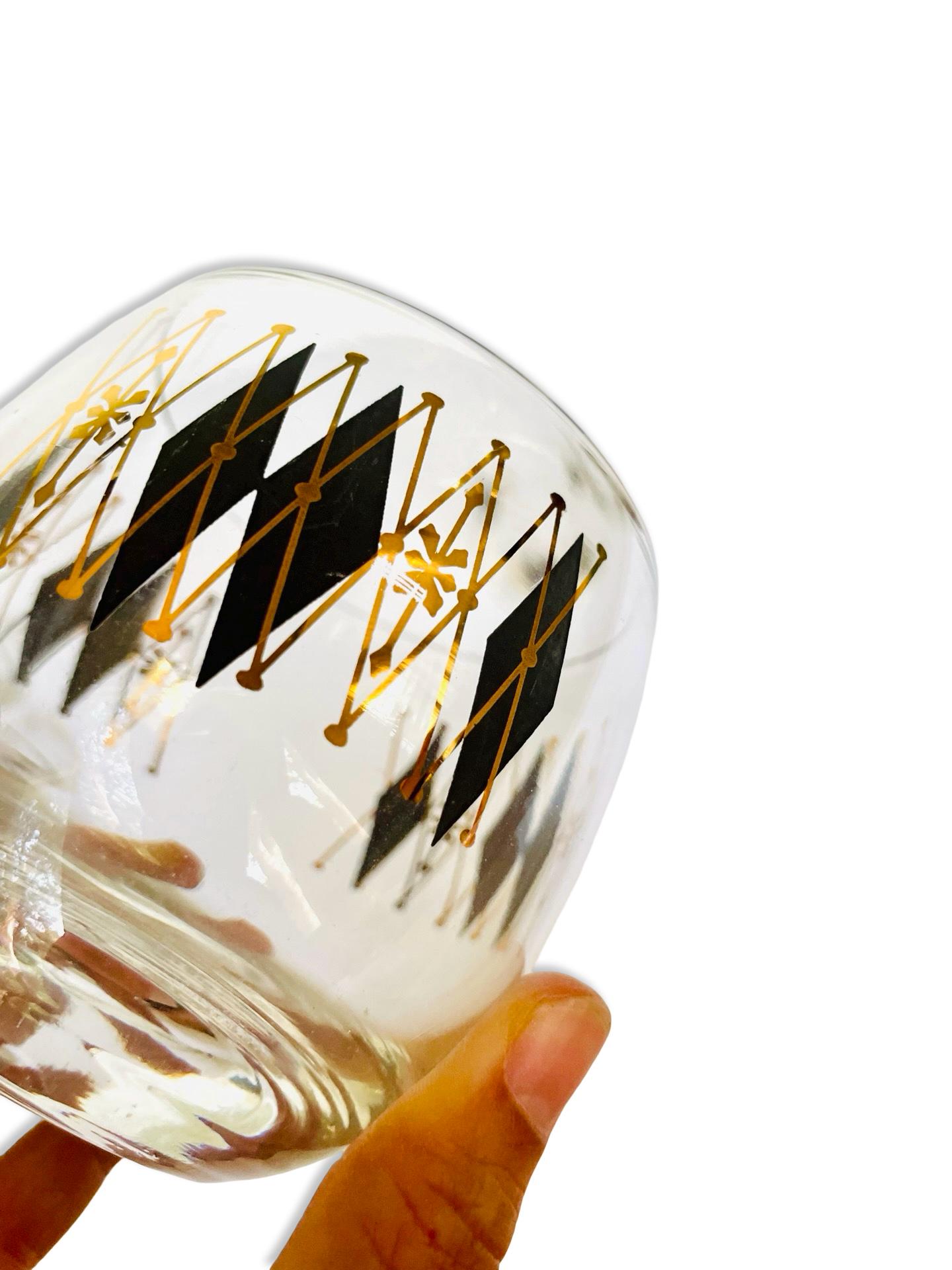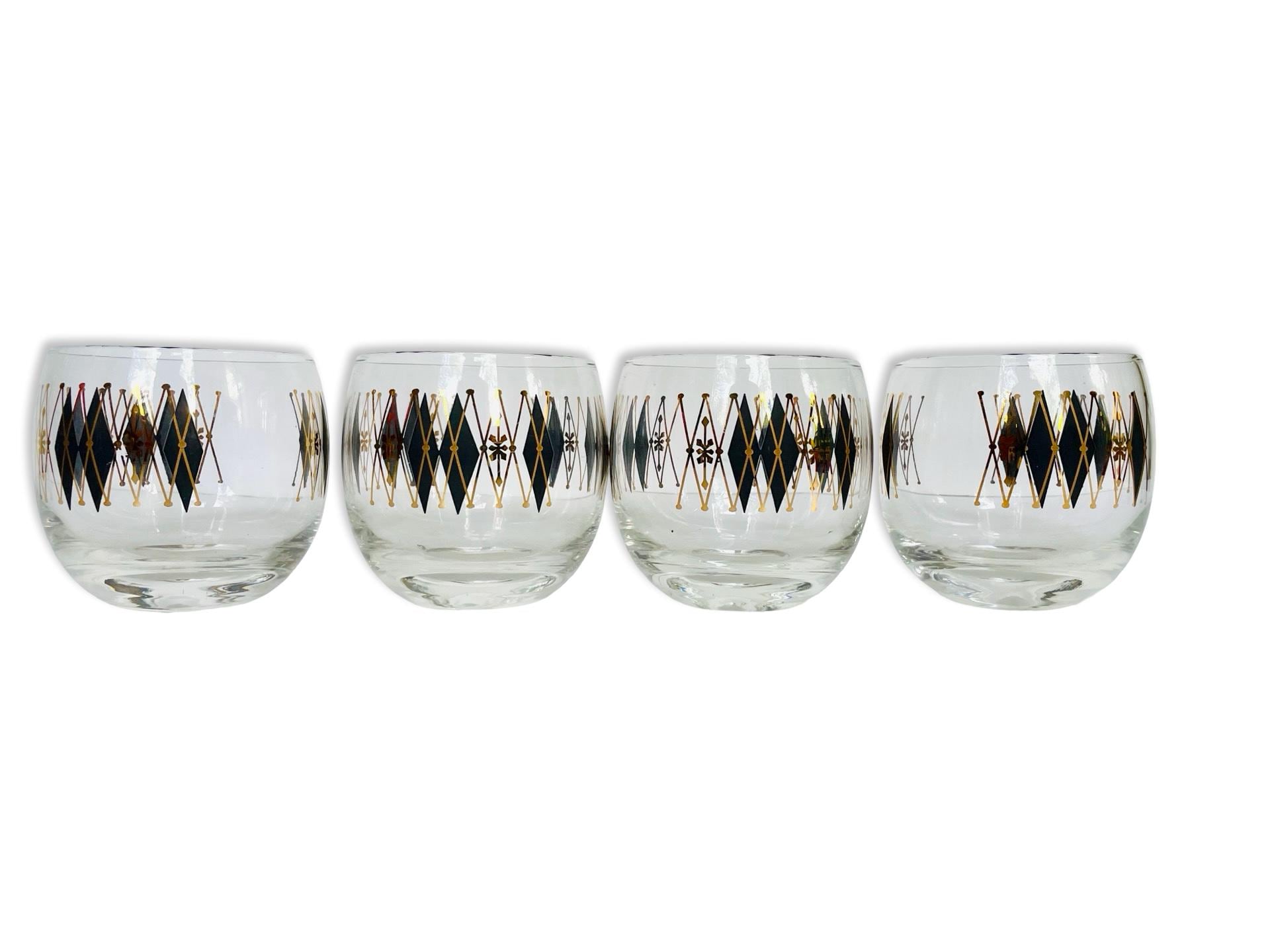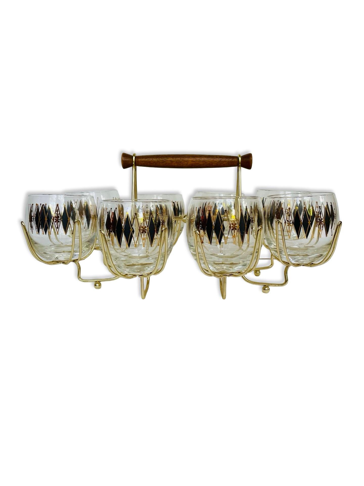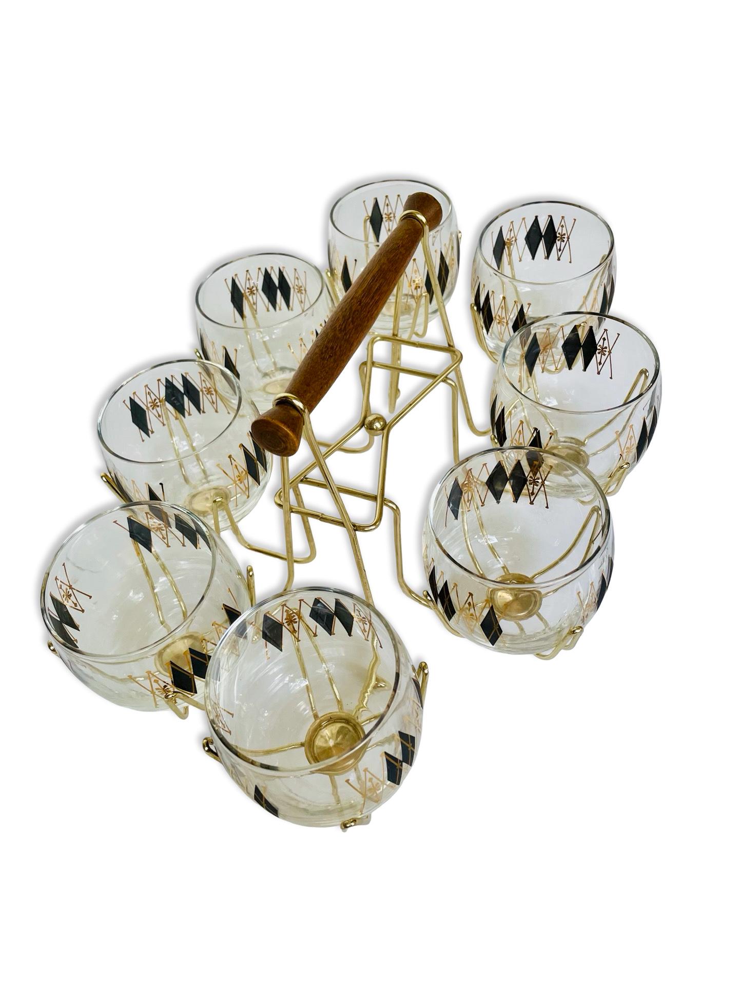 Serve cocktails in true mid-century style with this stunning Federal Glass bar set. Featuring eight roly poly glasses adorned with bold black and gold harlequin diamond designs, this set is as chic as it is functional. The original gold-tone metal caddie with wooden handle completes the look, making it easy to carry and display.