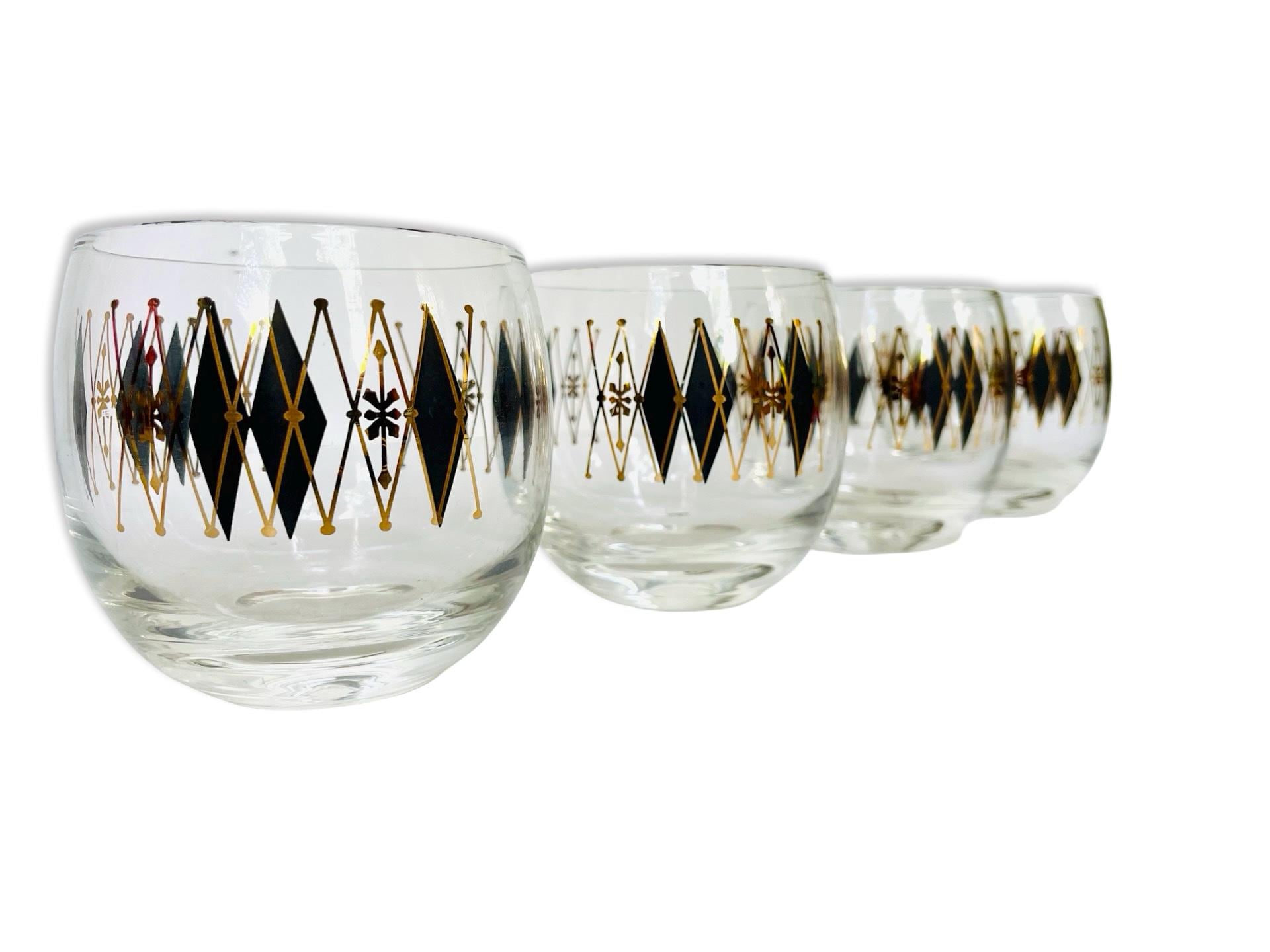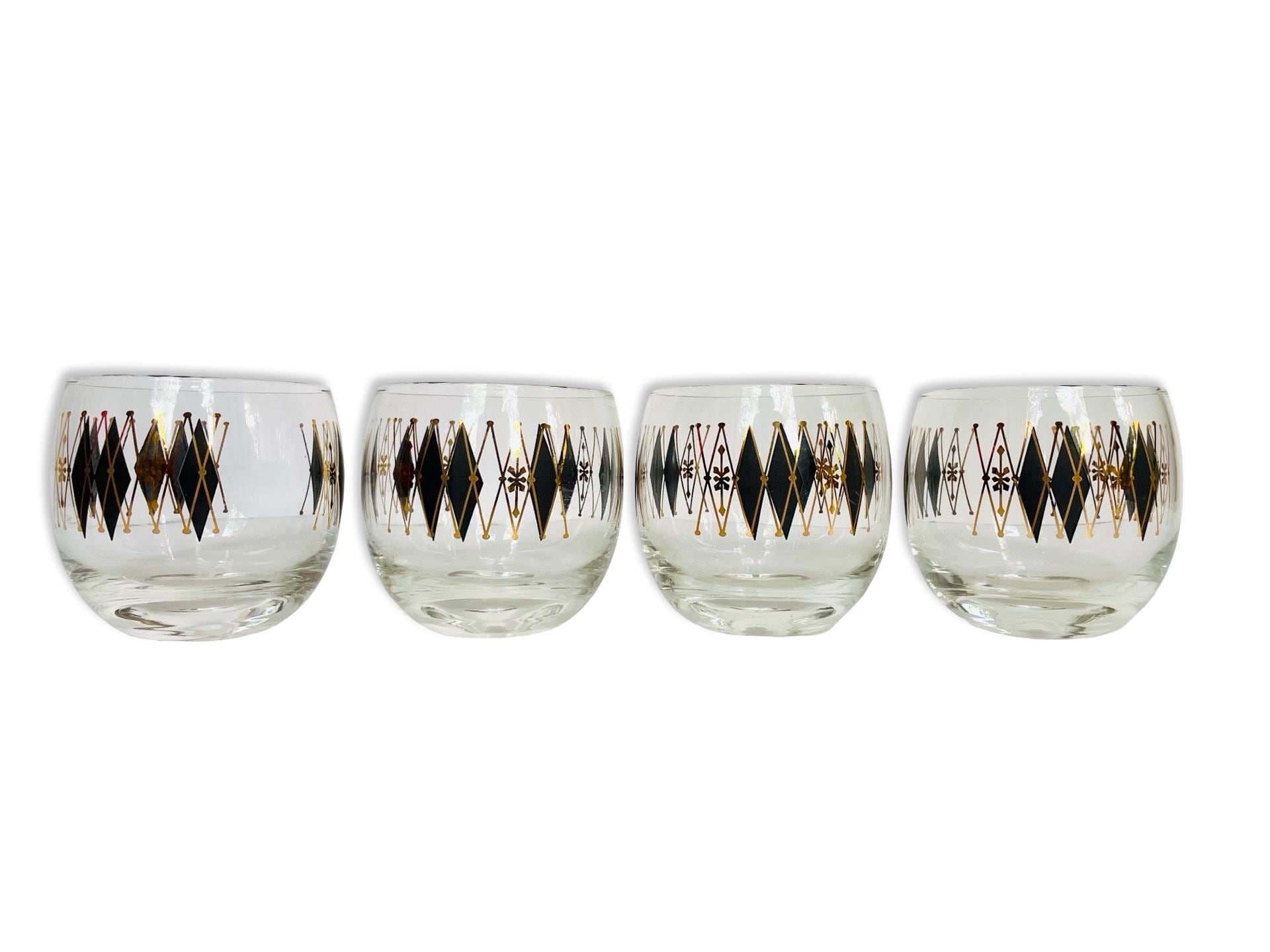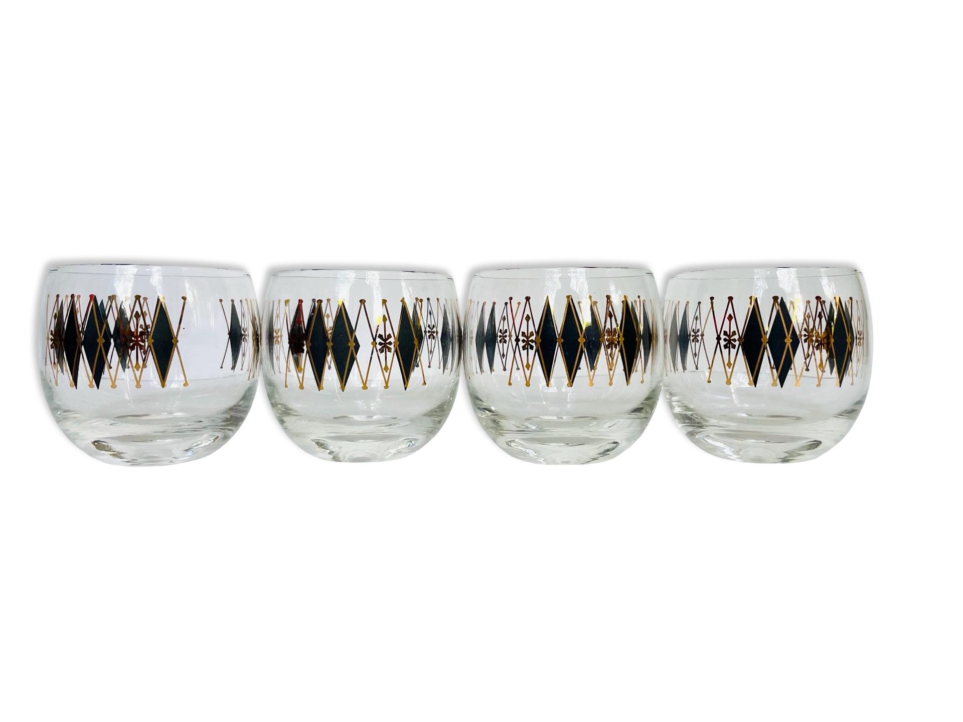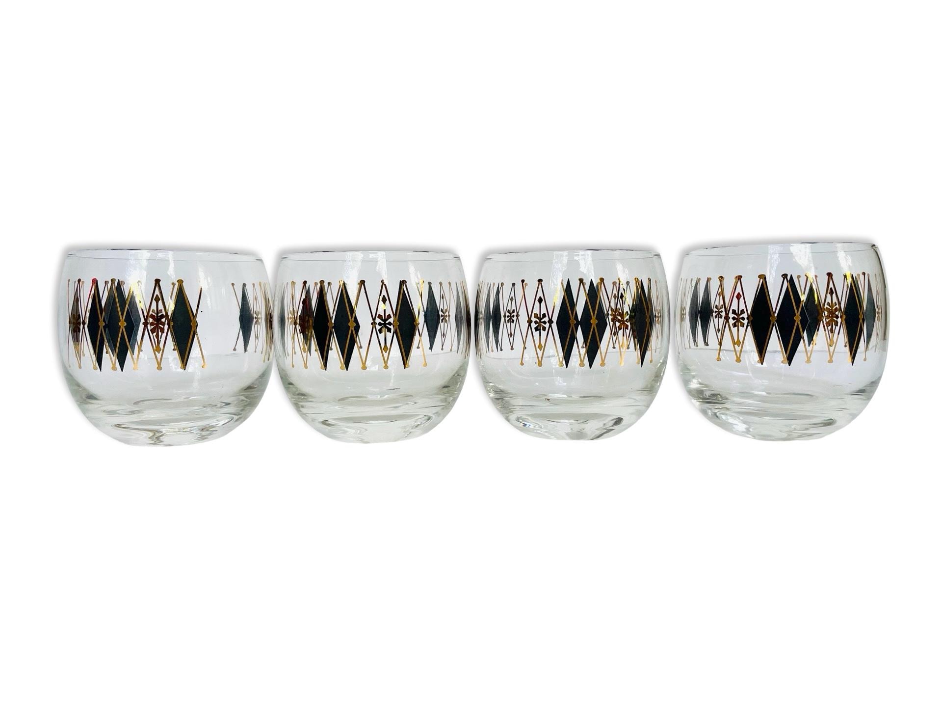Serve cocktails in true mid-century style with this stunning Federal Glass bar set. Featuring eight roly poly glasses adorned with bold black and gold harlequin diamond designs, this set is as chic as it is functional. The original gold-tone metal caddie with wooden handle completes the look, making it easy to carry and display.