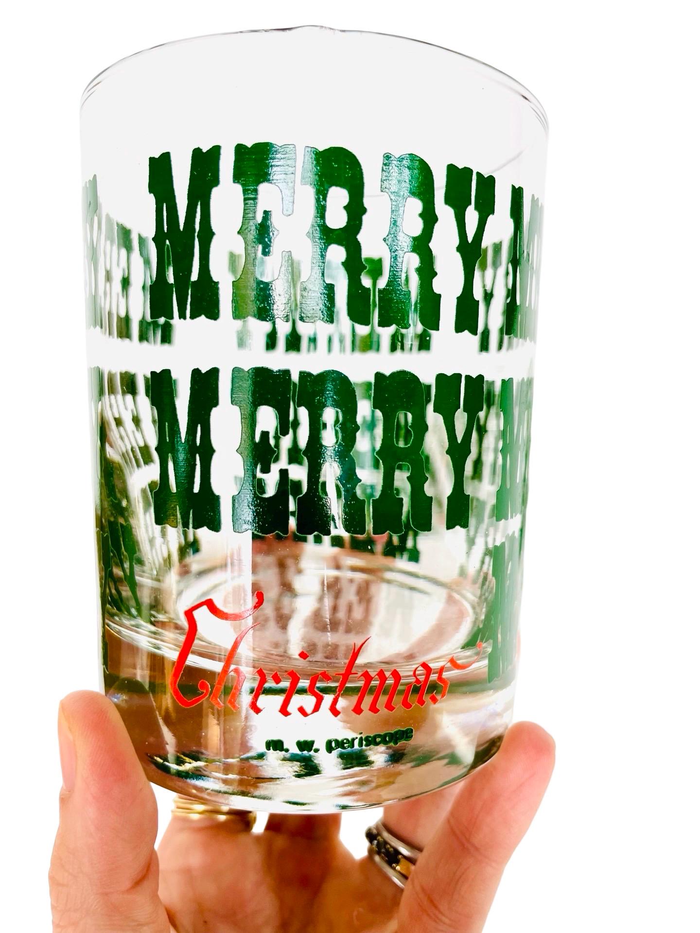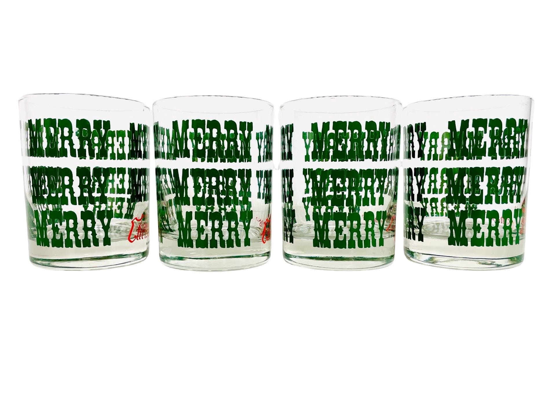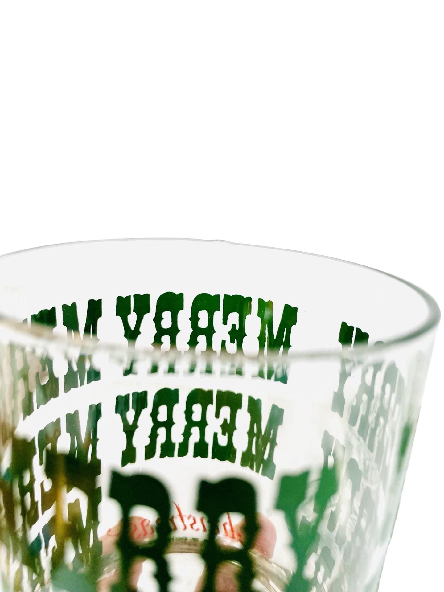 Add a little jolly nostalgia to your holiday bar cart with this cheerful set of 4 vintage M.W. Periscope Christmas glasses. Featuring bold green “MERRY” typography wrapped around each glass and a bright red “Christmas” script along the base, these tumblers bring that perfect retro punch to any festive gathering.