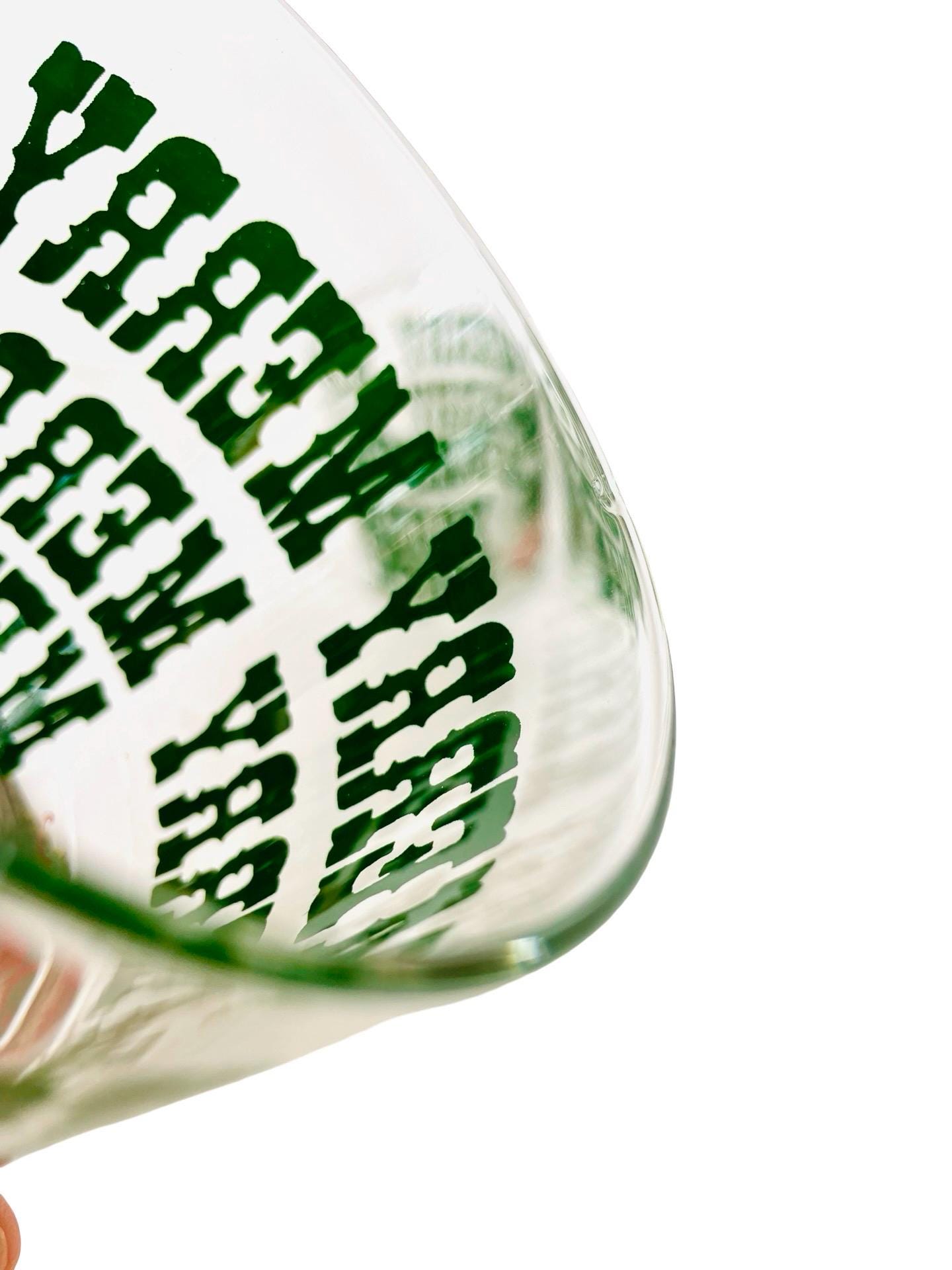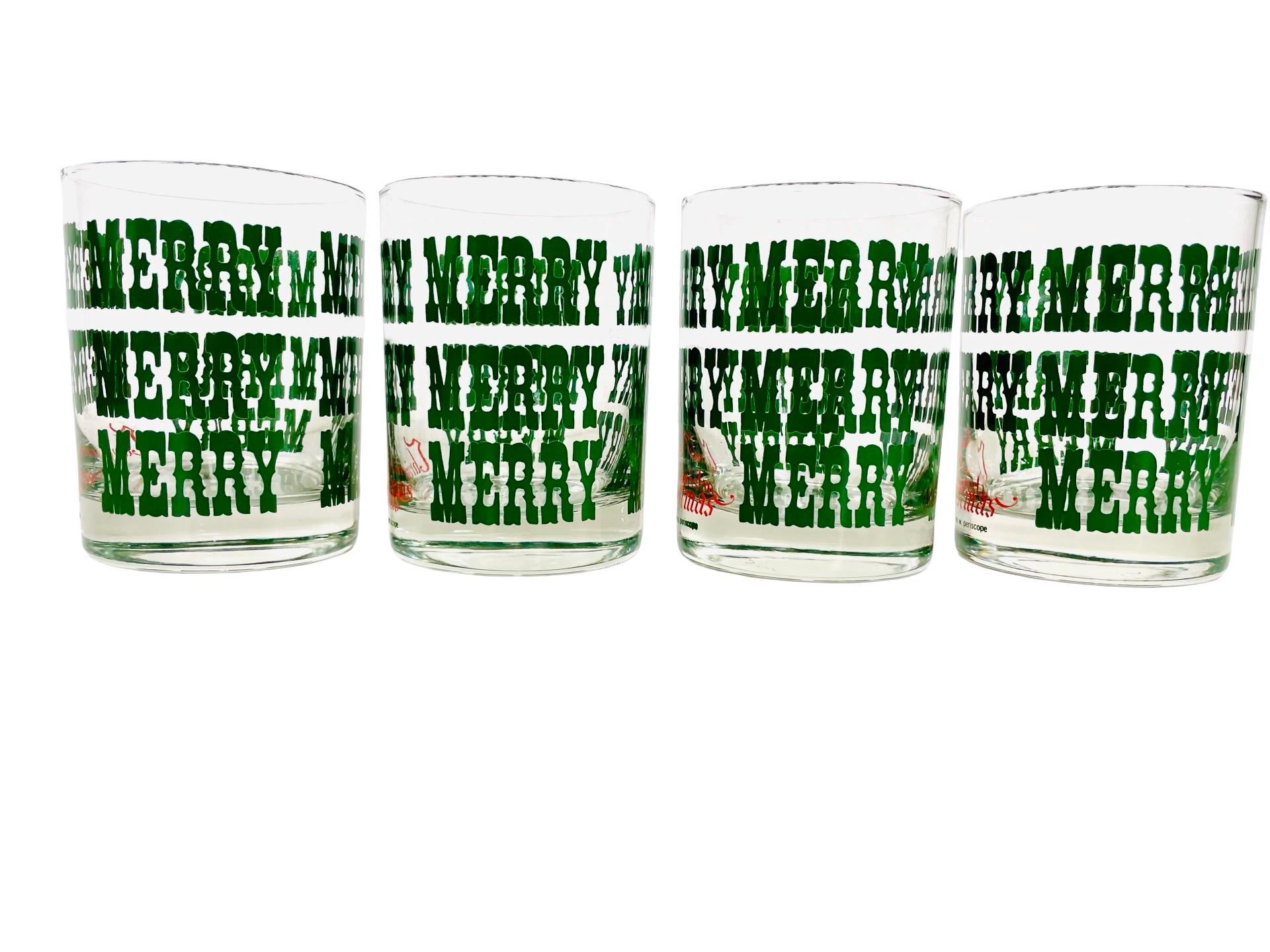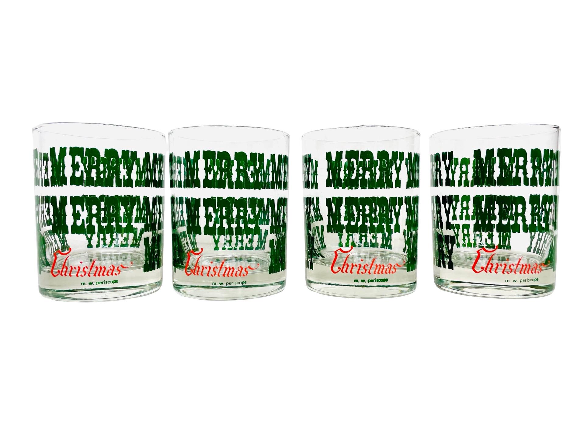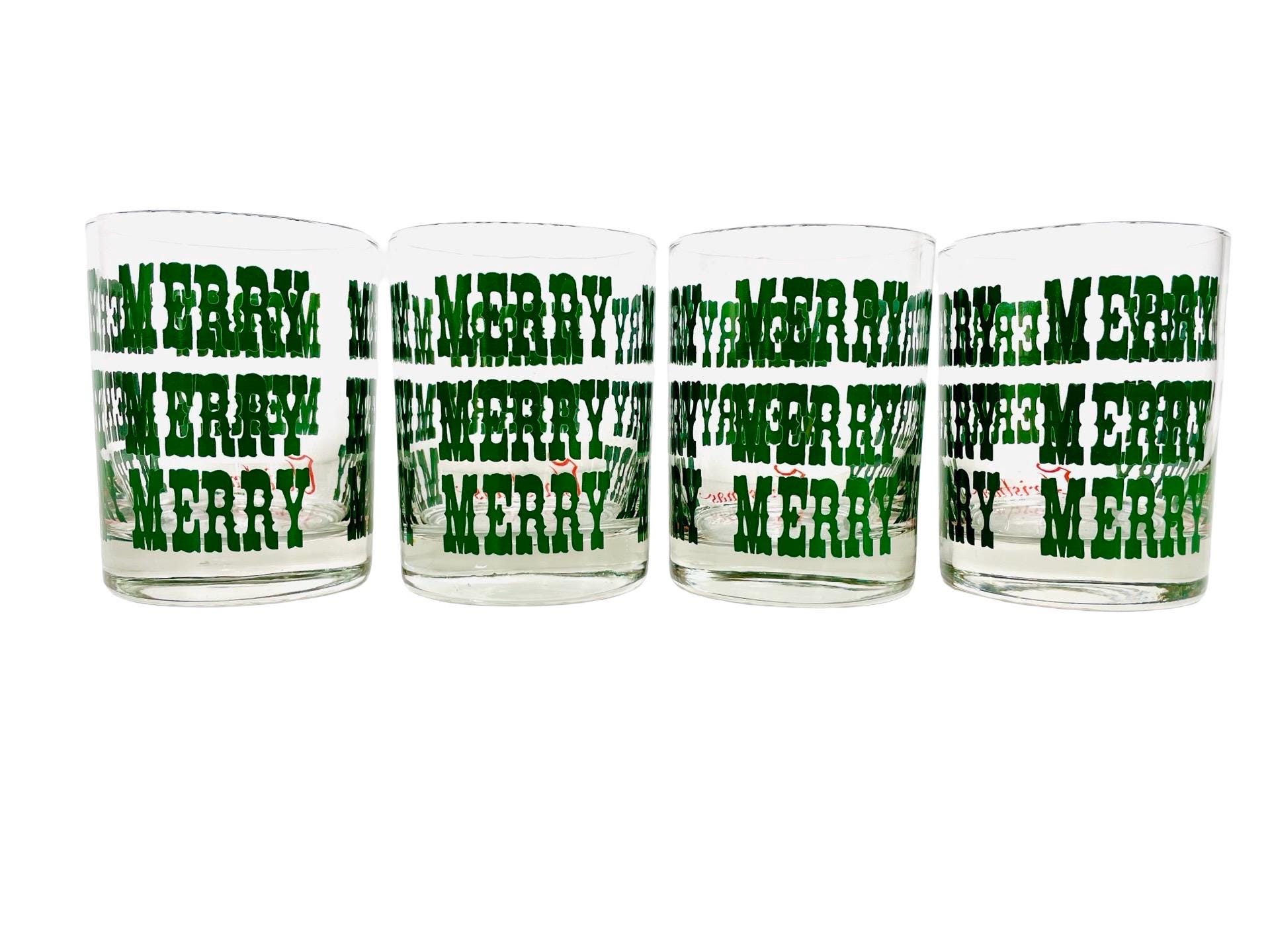 Add a little jolly nostalgia to your holiday bar cart with this cheerful set of 4 vintage M.W. Periscope Christmas glasses. Featuring bold green “MERRY” typography wrapped around each glass and a bright red “Christmas” script along the base, these tumblers bring that perfect retro punch to any festive gathering.