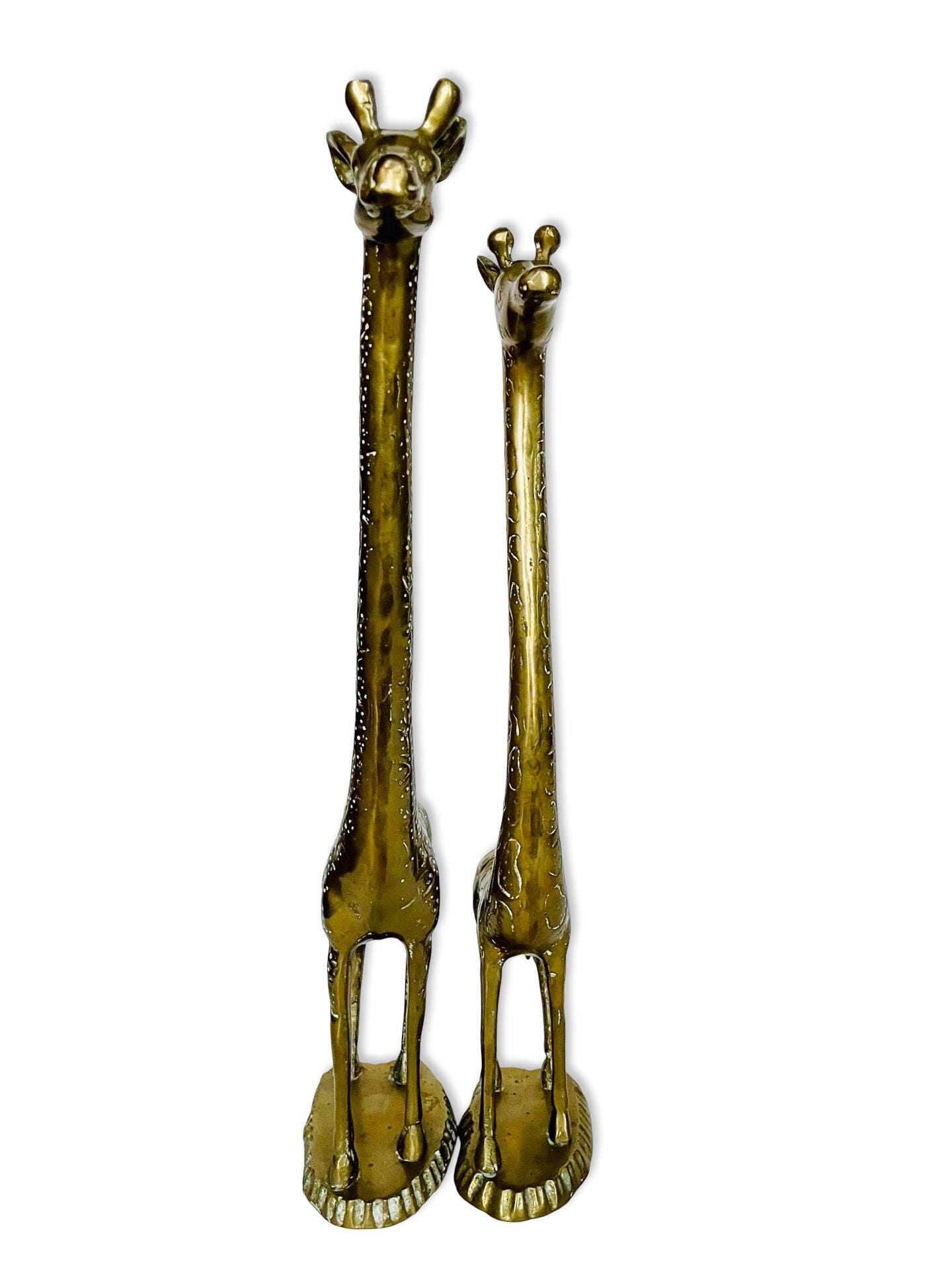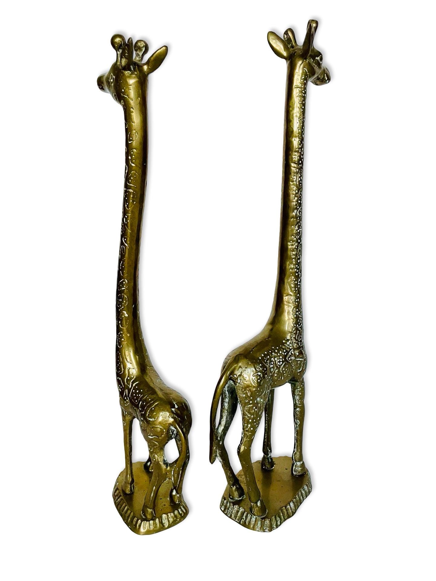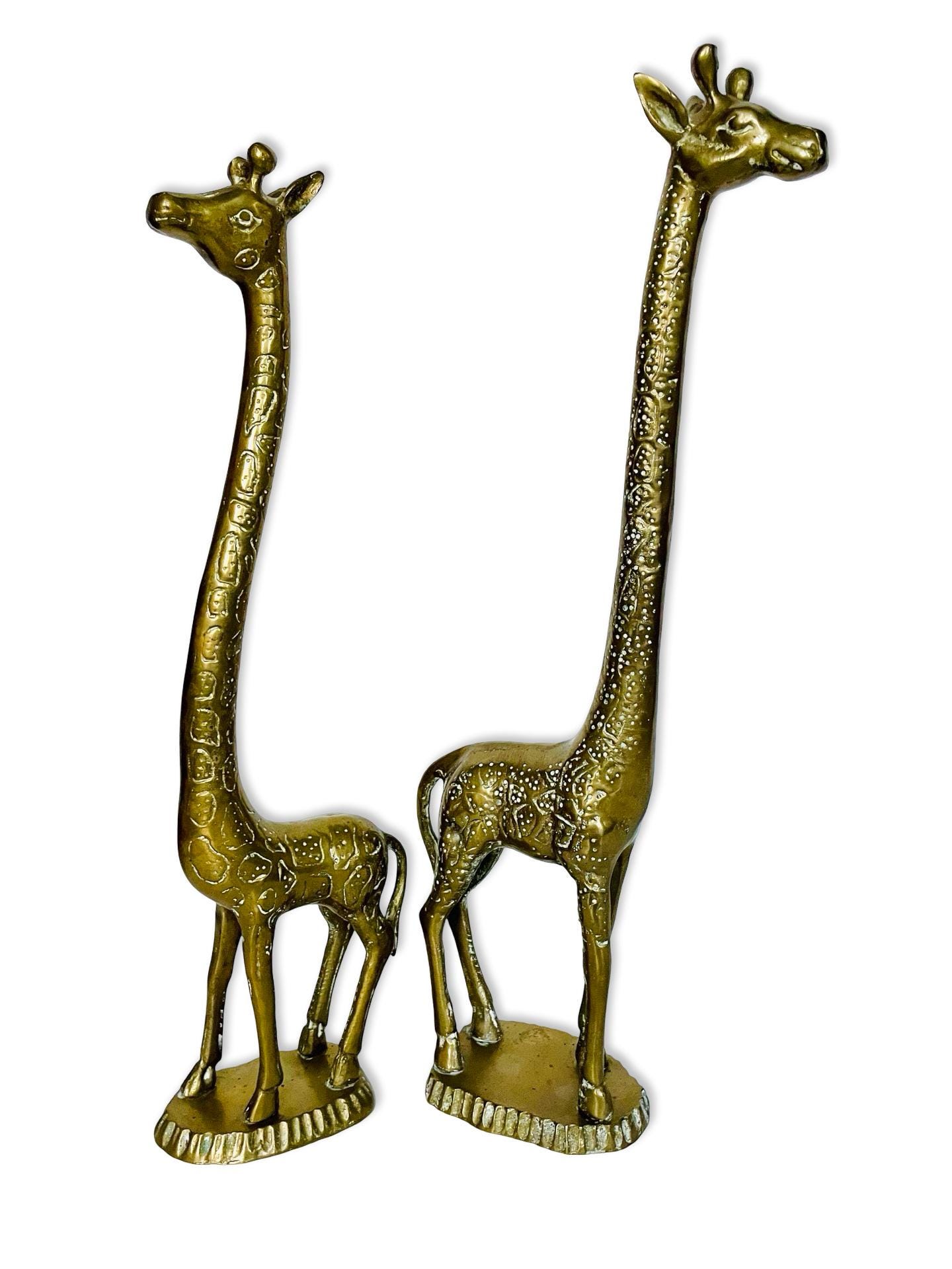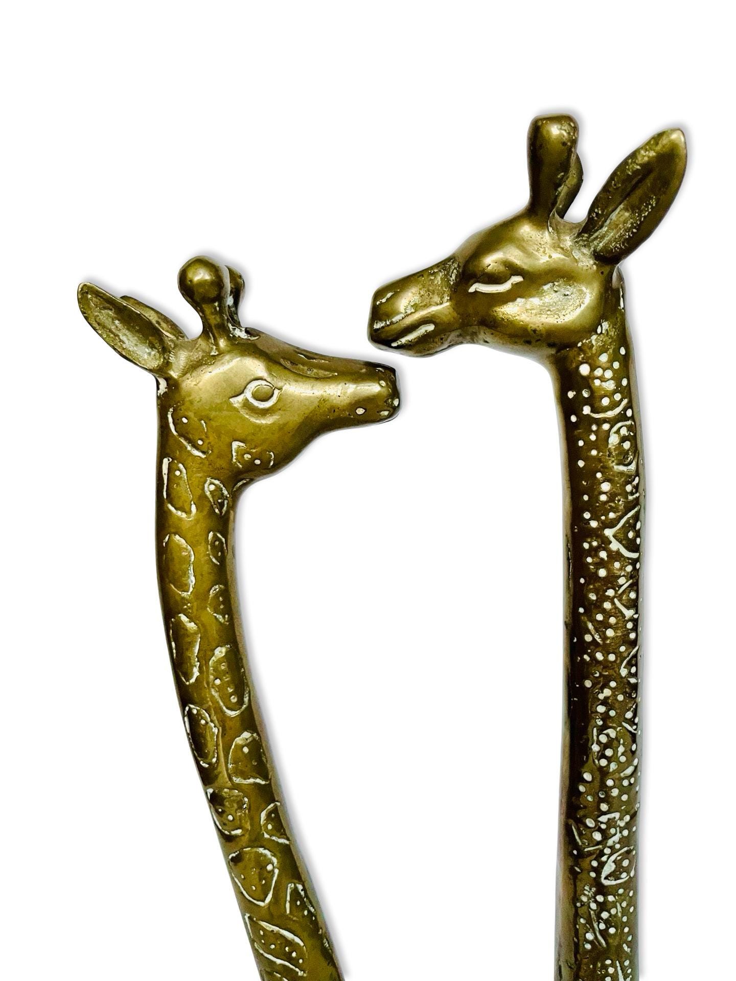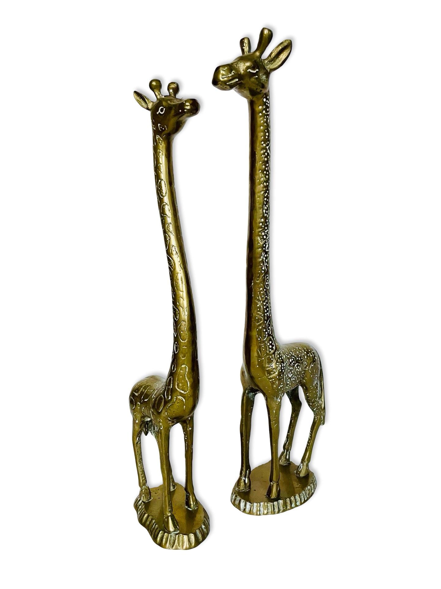 A charming and sculptural pair of vintage brass giraffes with beautifully elongated necks and warm, timeworn patina. These pieces have that perfect mix of elegance and playfulness—classic animal forms with a mid-century sensibility.