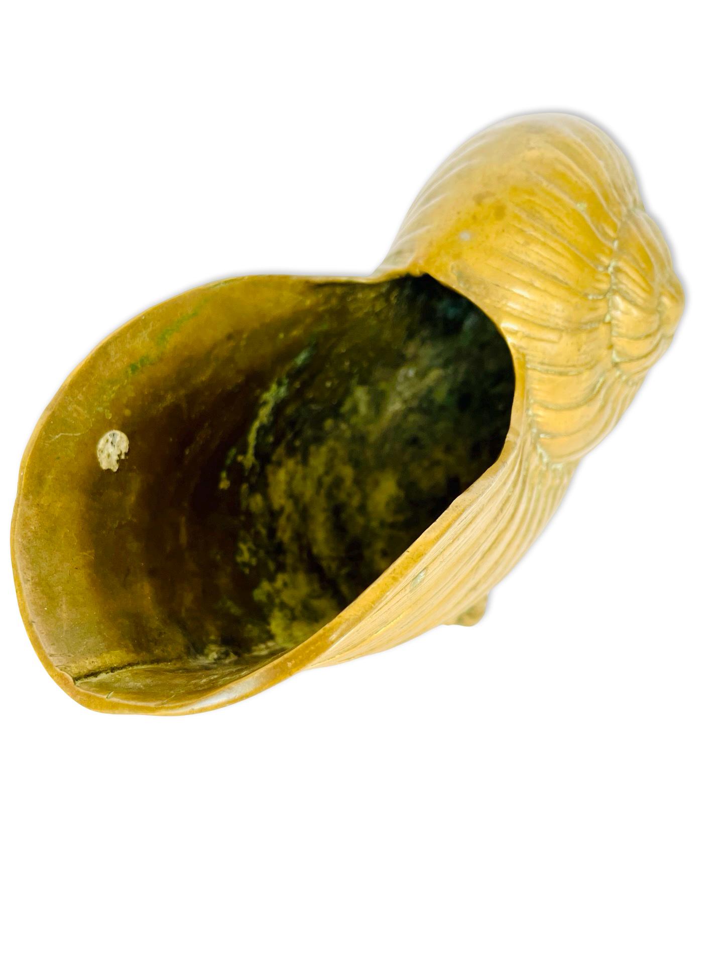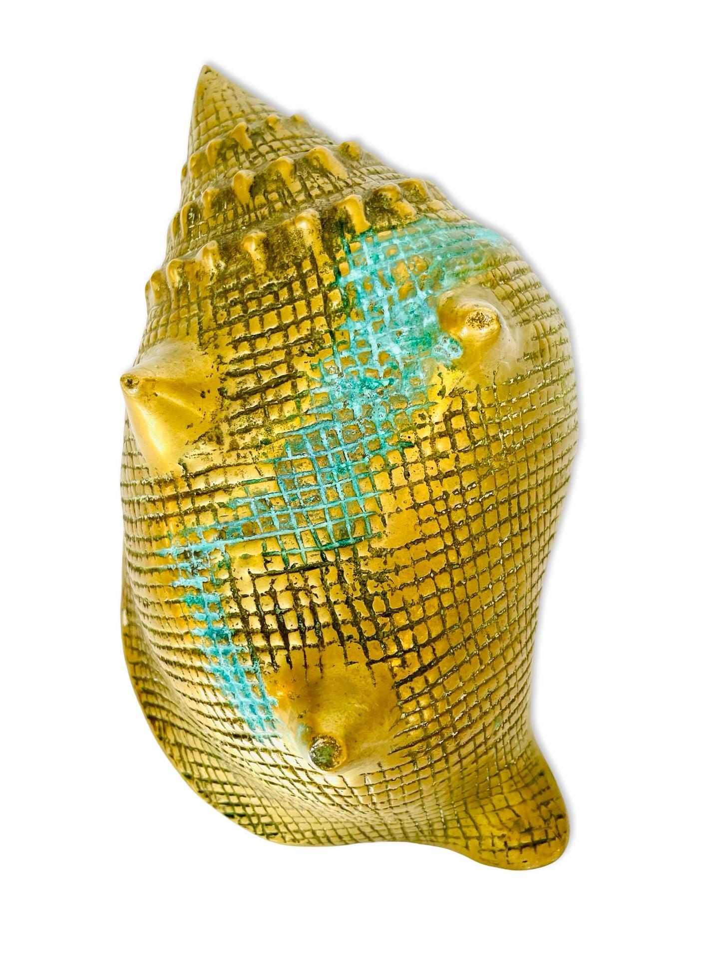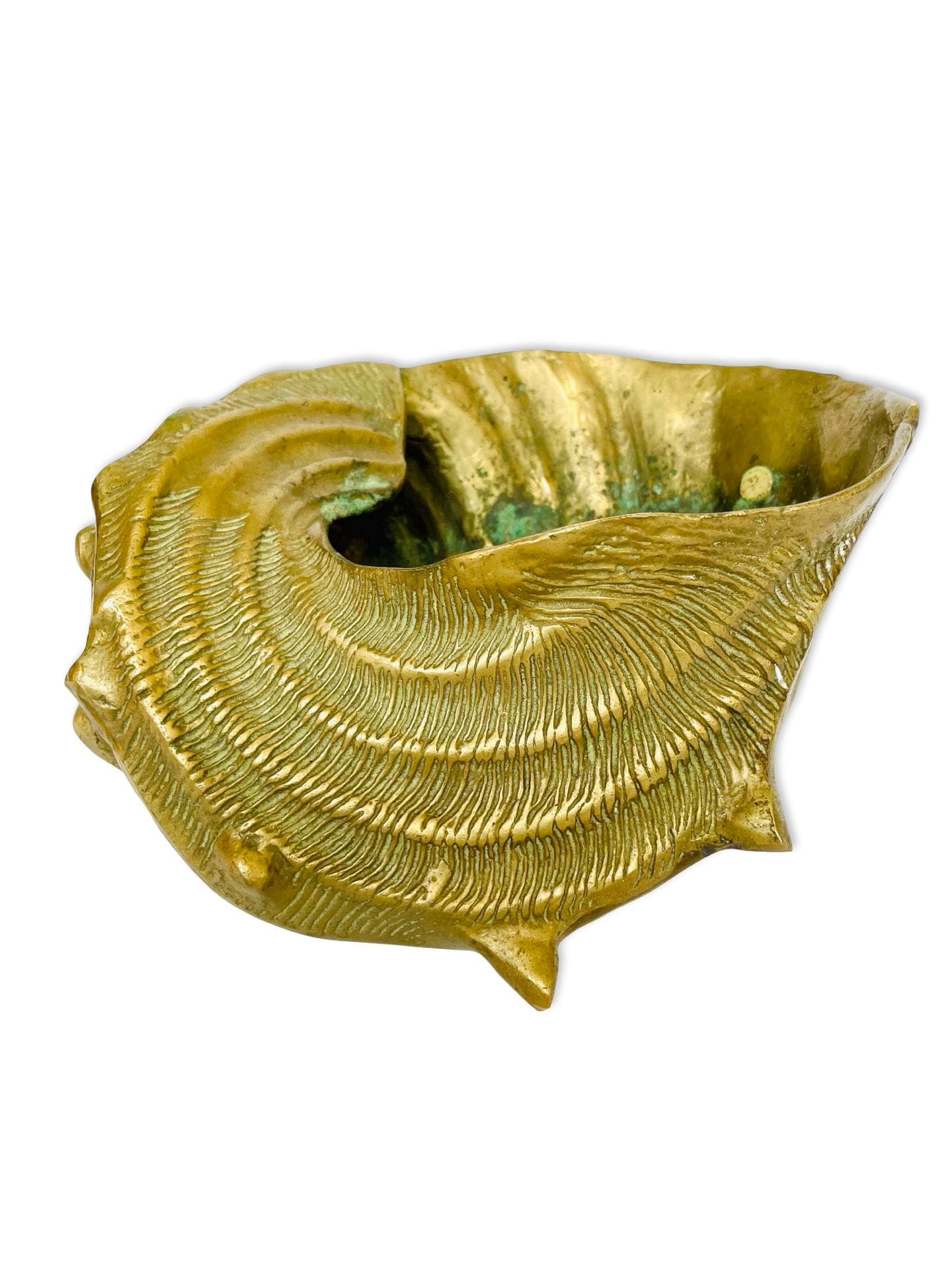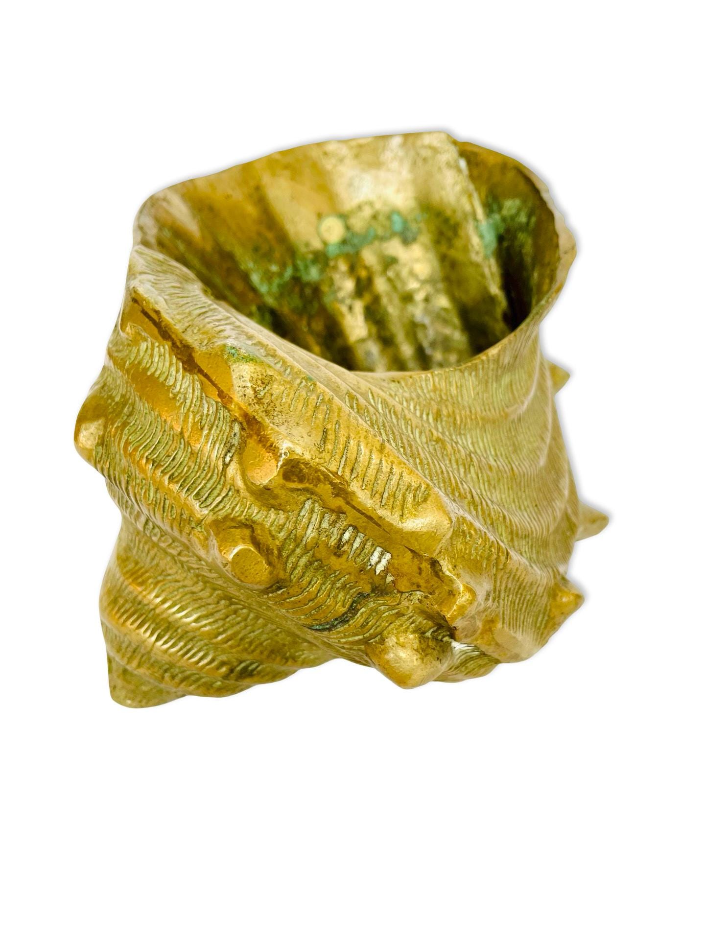 Three distinct oversized shell forms—a sculptural nautilus, a ridged clam-style vessel, and a textured conch—each with its own personality and patina. The warm brass tones paired with subtle verdigris accents give them that perfectly aged, found-on-a-treasure-hunt feel.