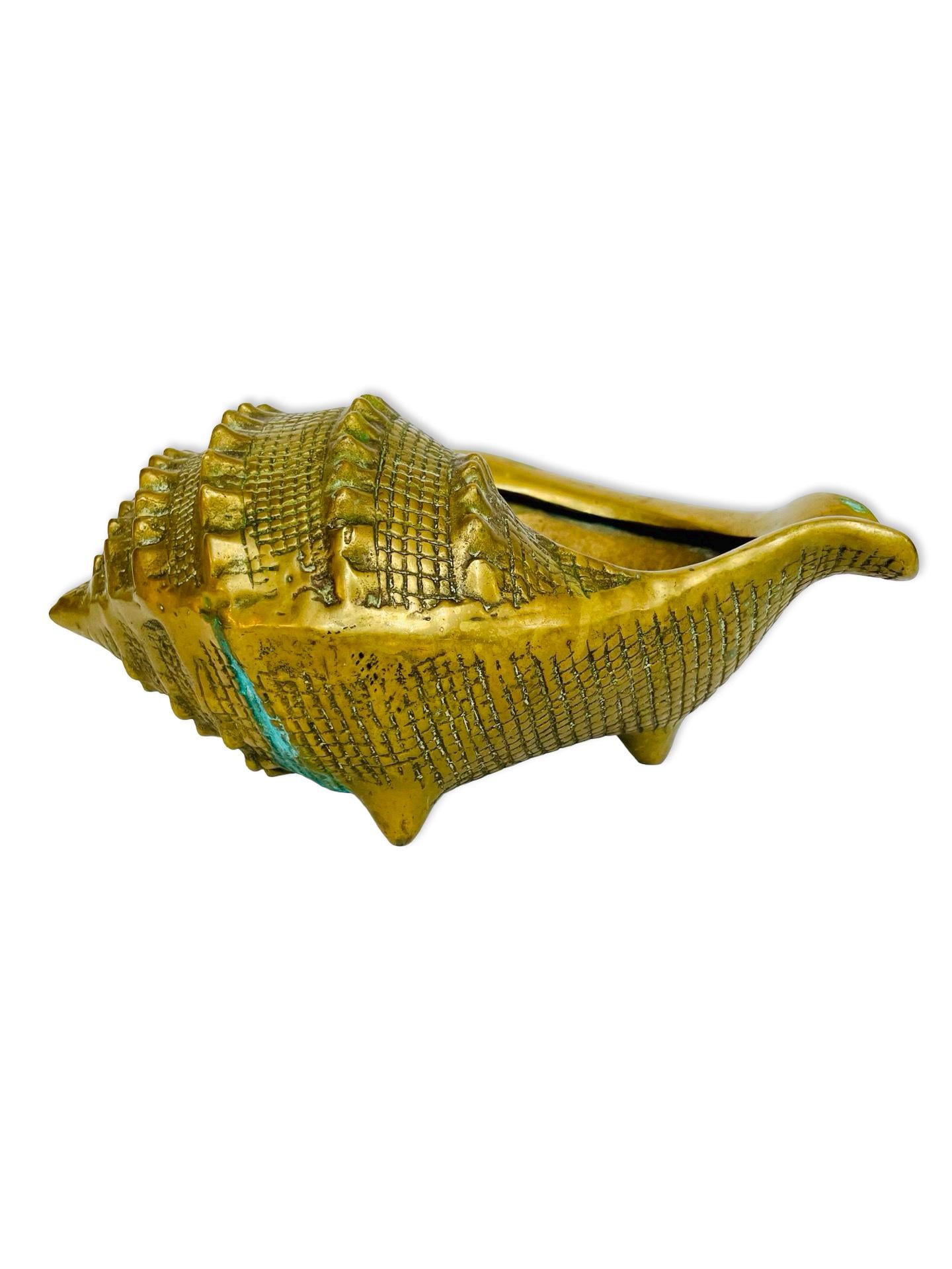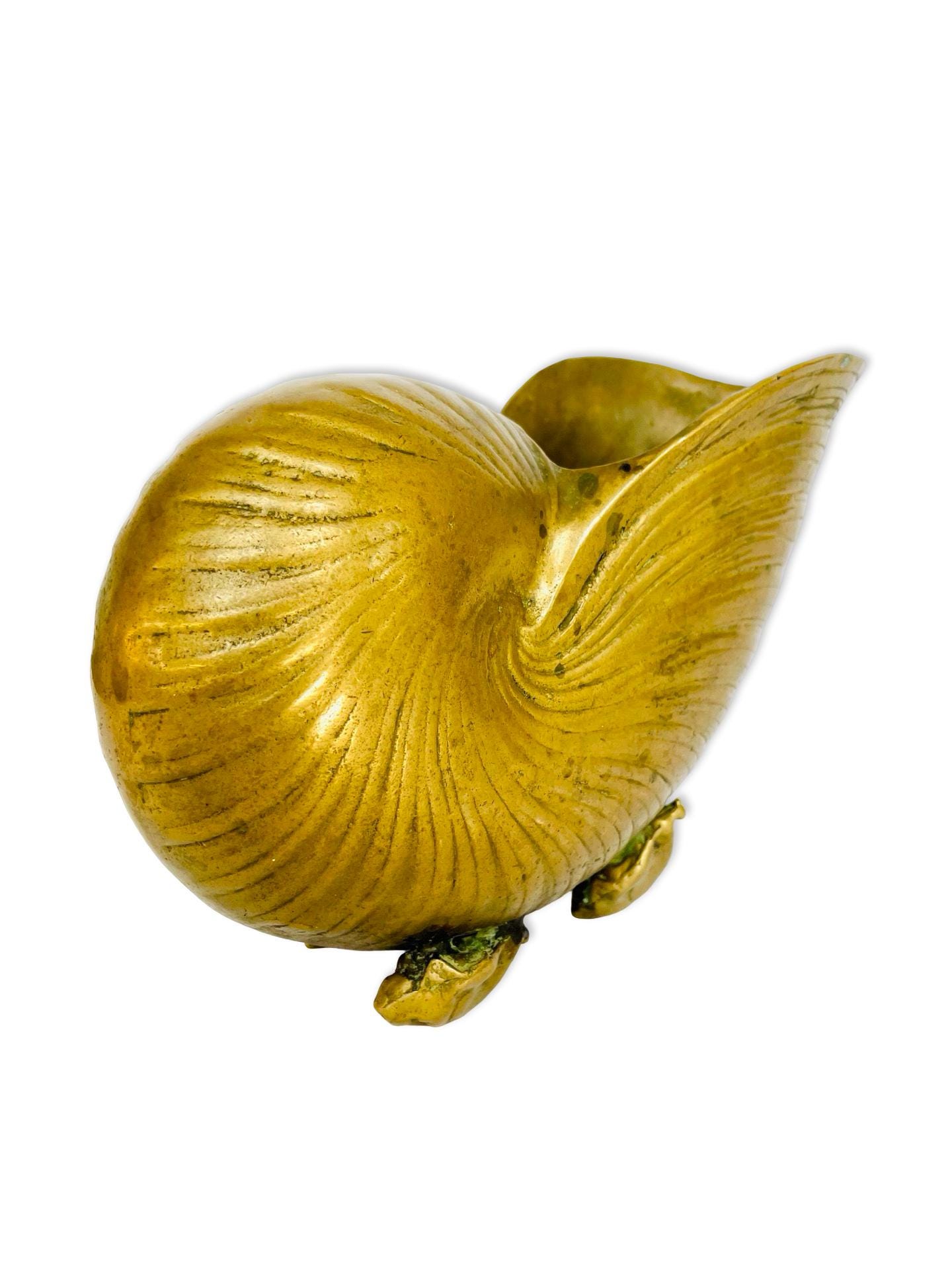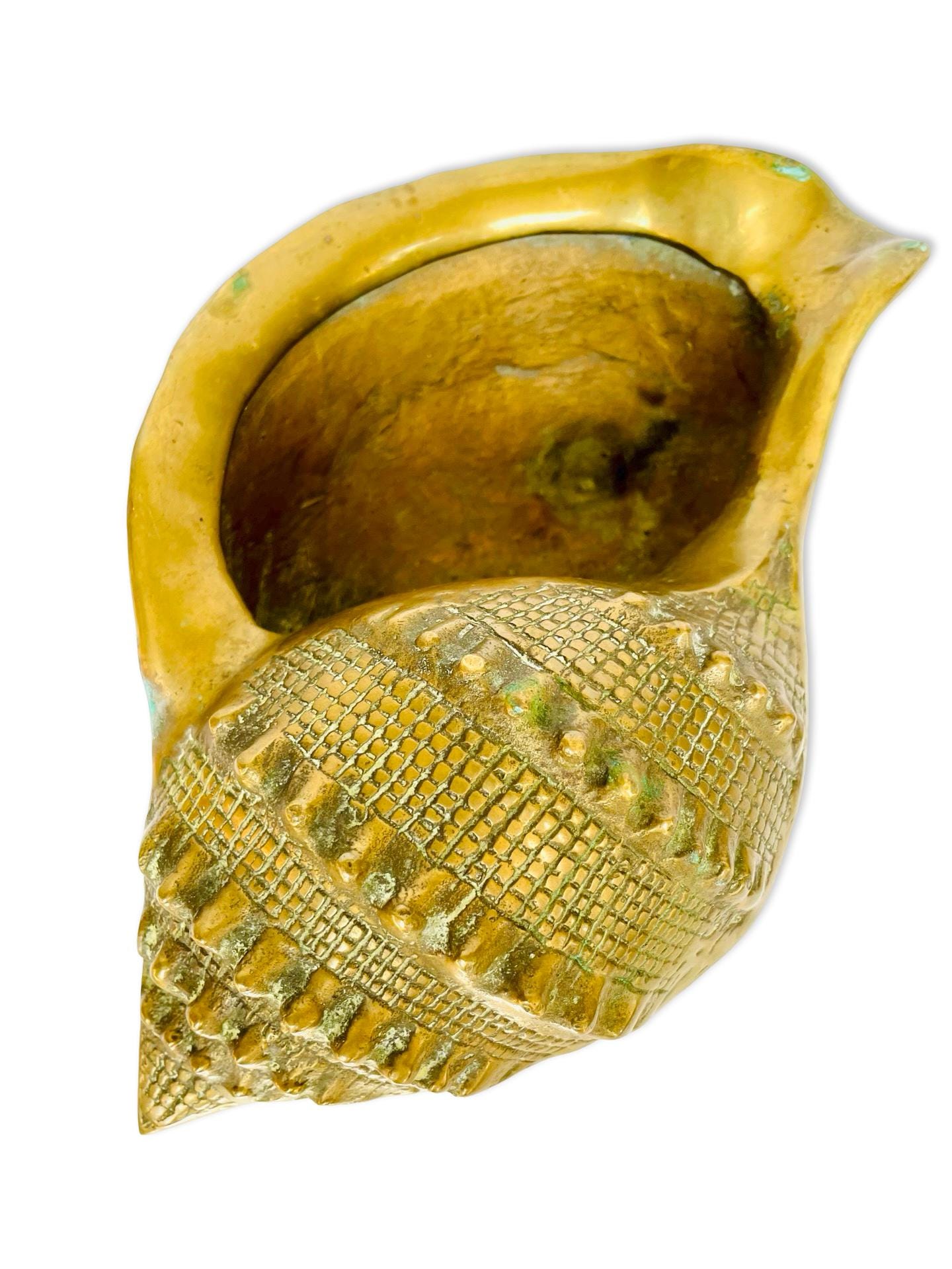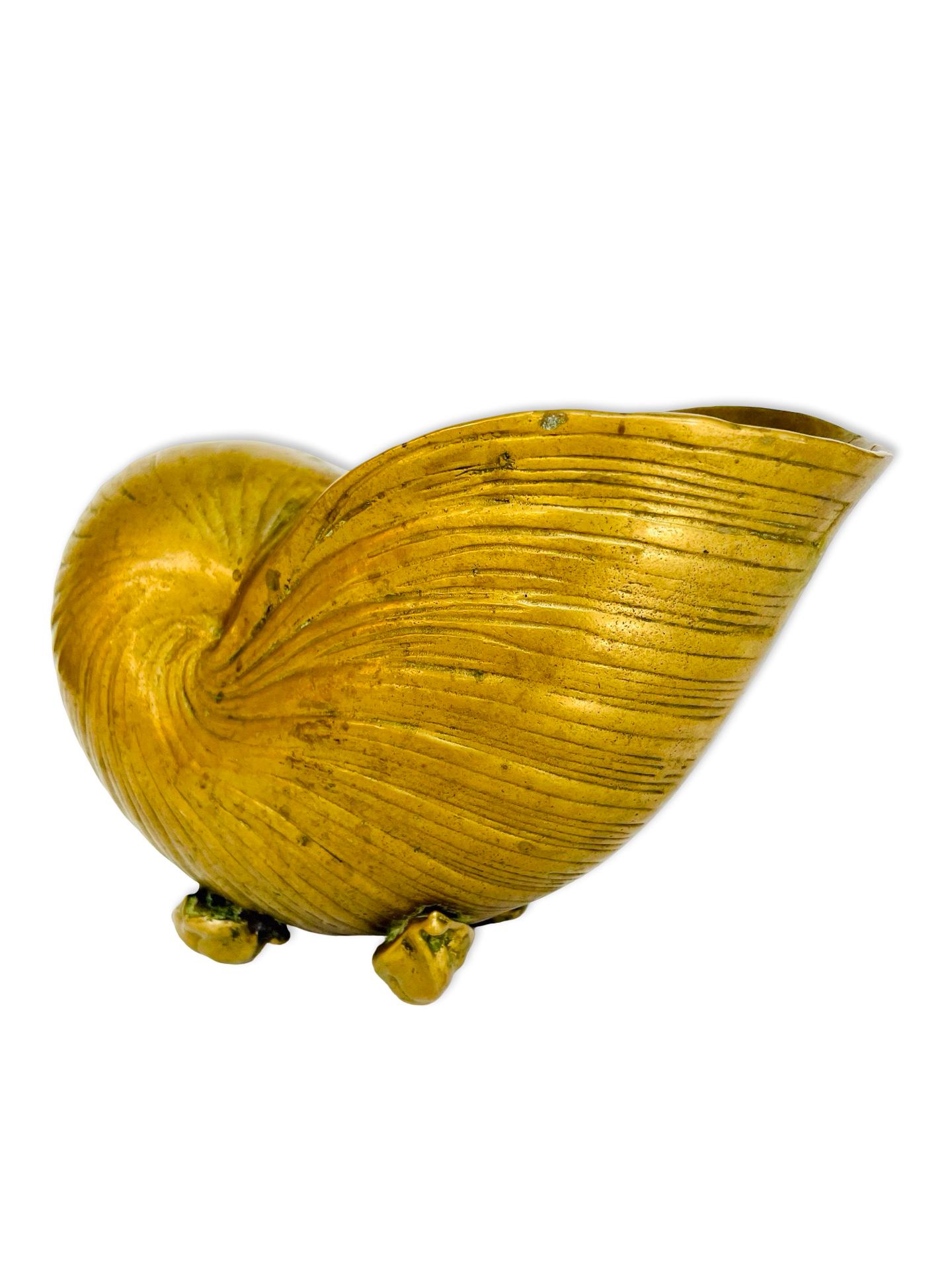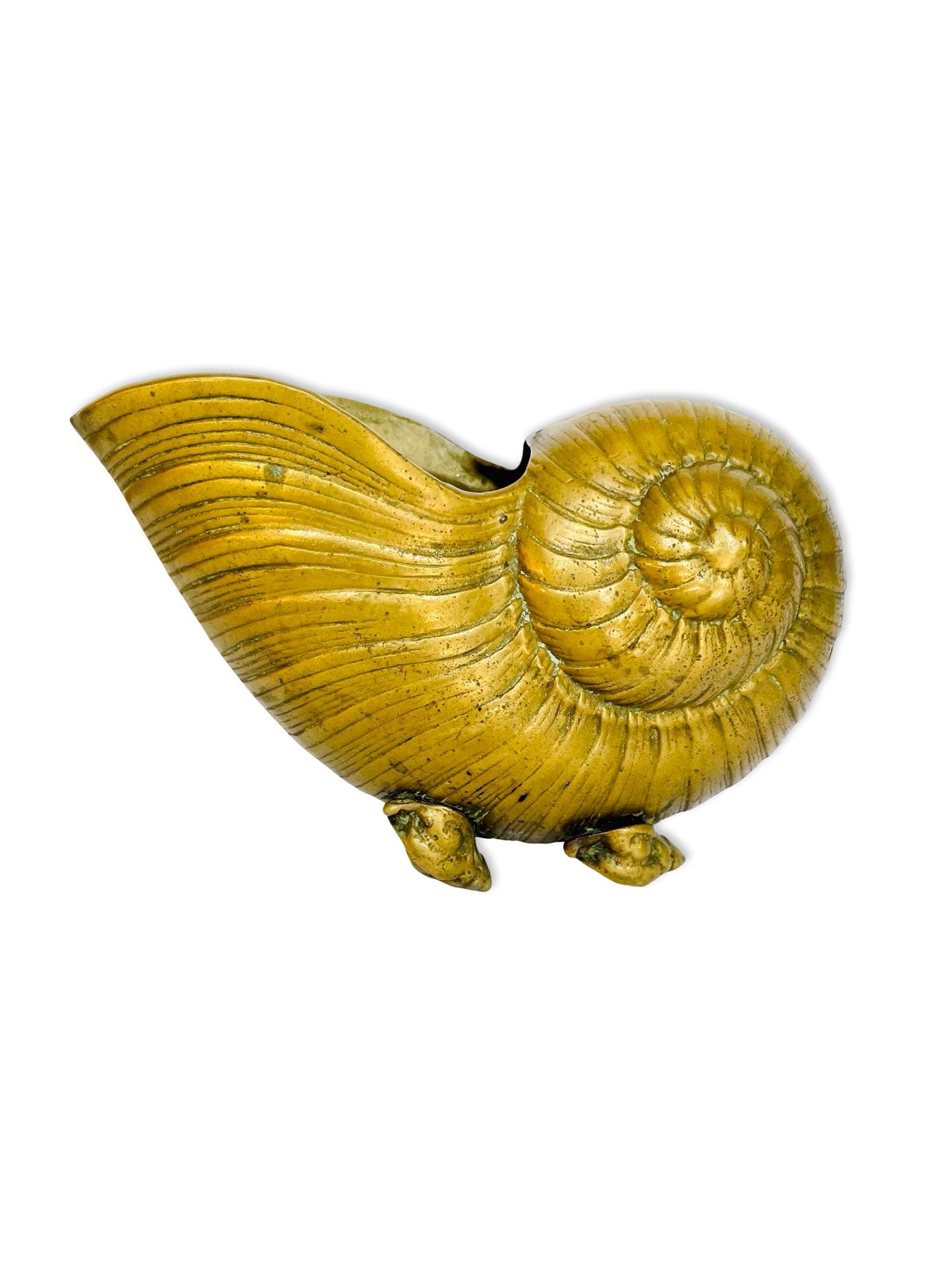 Three distinct oversized shell forms—a sculptural nautilus, a ridged clam-style vessel, and a textured conch—each with its own personality and patina. The warm brass tones paired with subtle verdigris accents give them that perfectly aged, found-on-a-treasure-hunt feel.