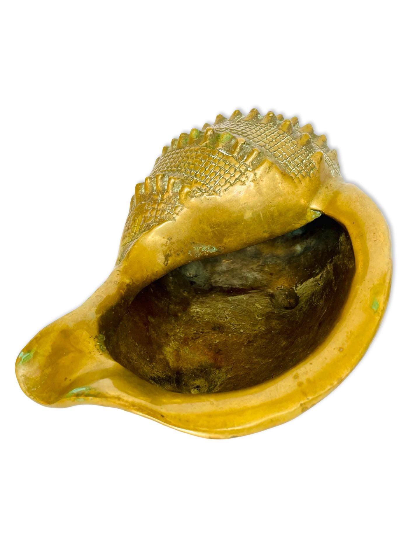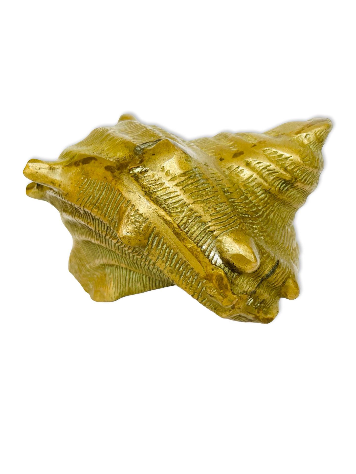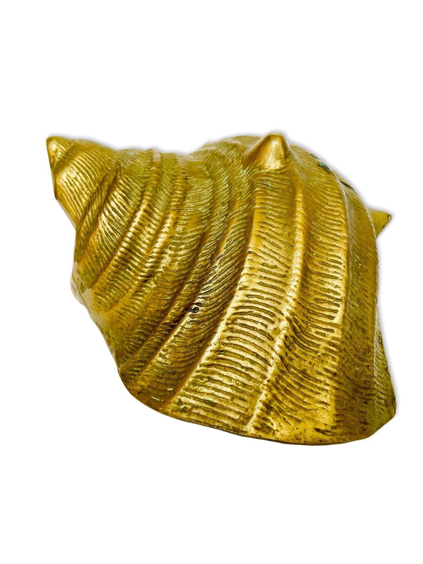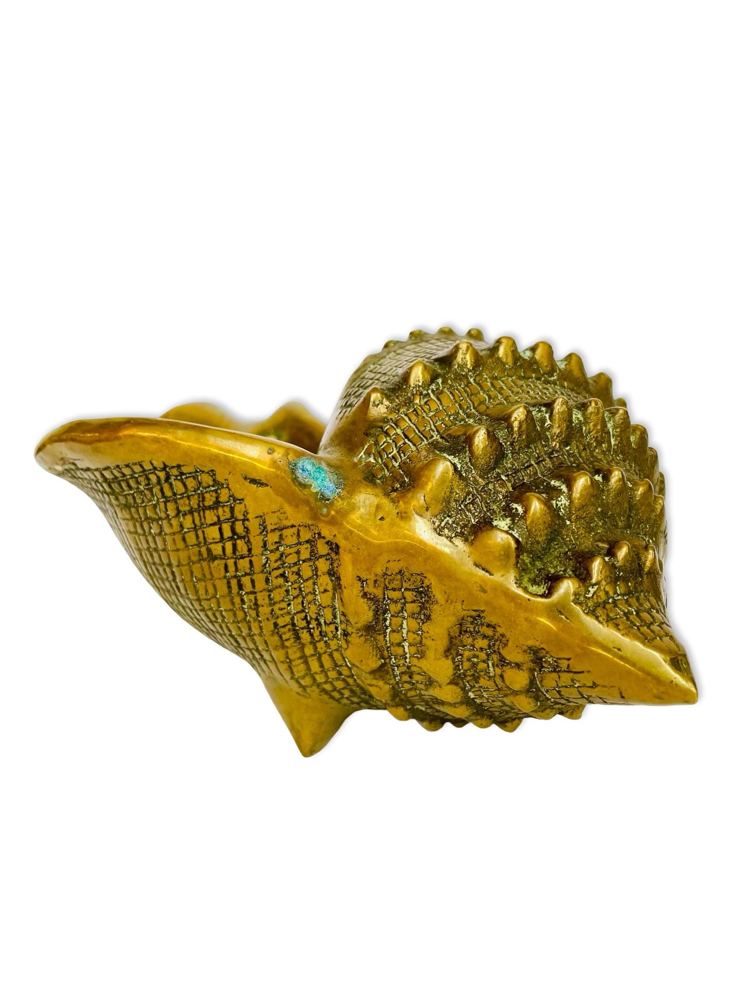 Three distinct oversized shell forms—a sculptural nautilus, a ridged clam-style vessel, and a textured conch—each with its own personality and patina. The warm brass tones paired with subtle verdigris accents give them that perfectly aged, found-on-a-treasure-hunt feel.