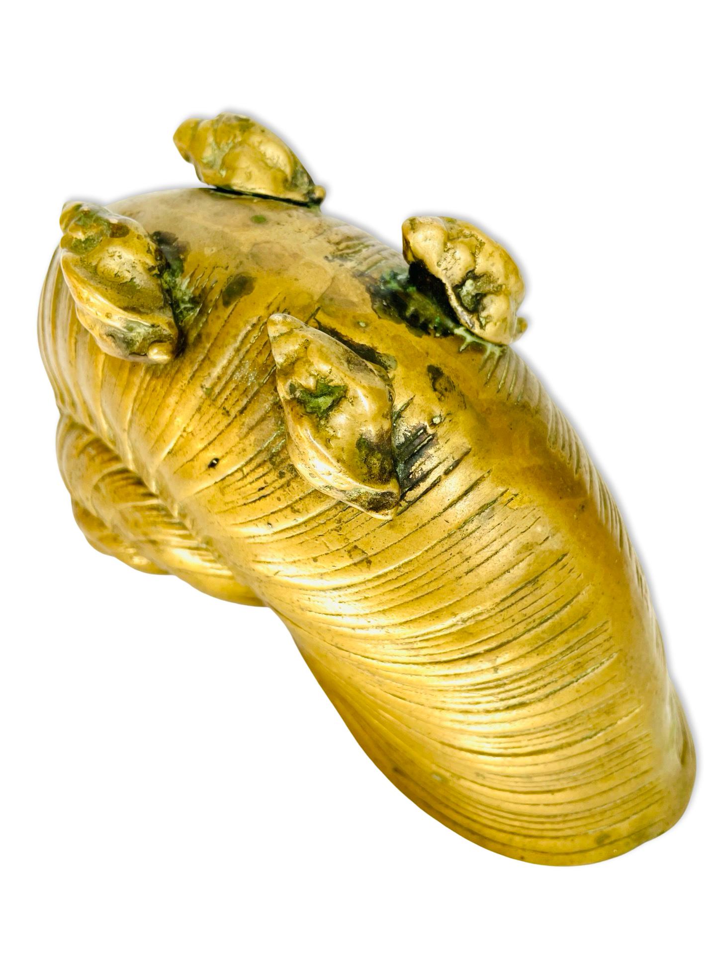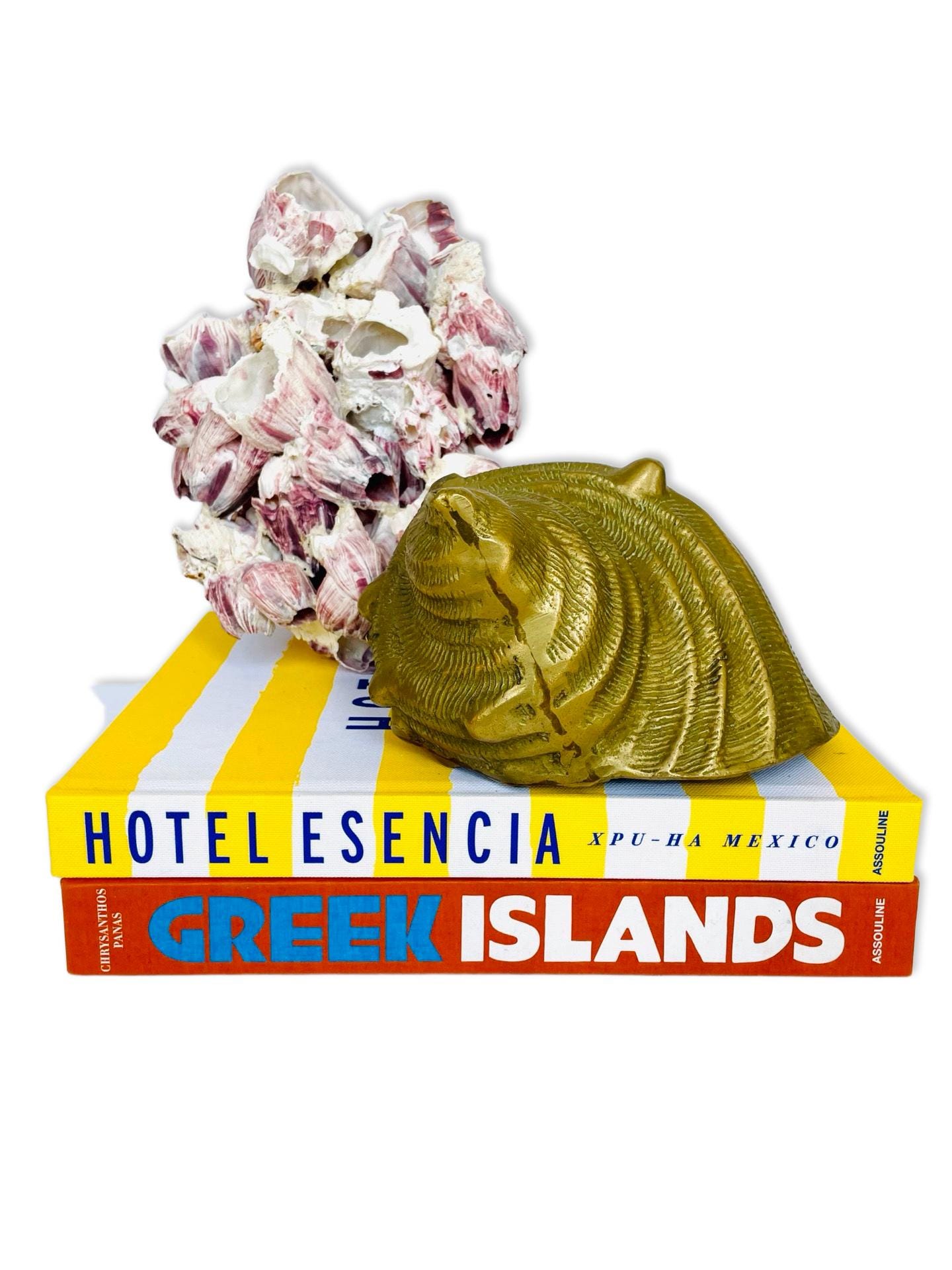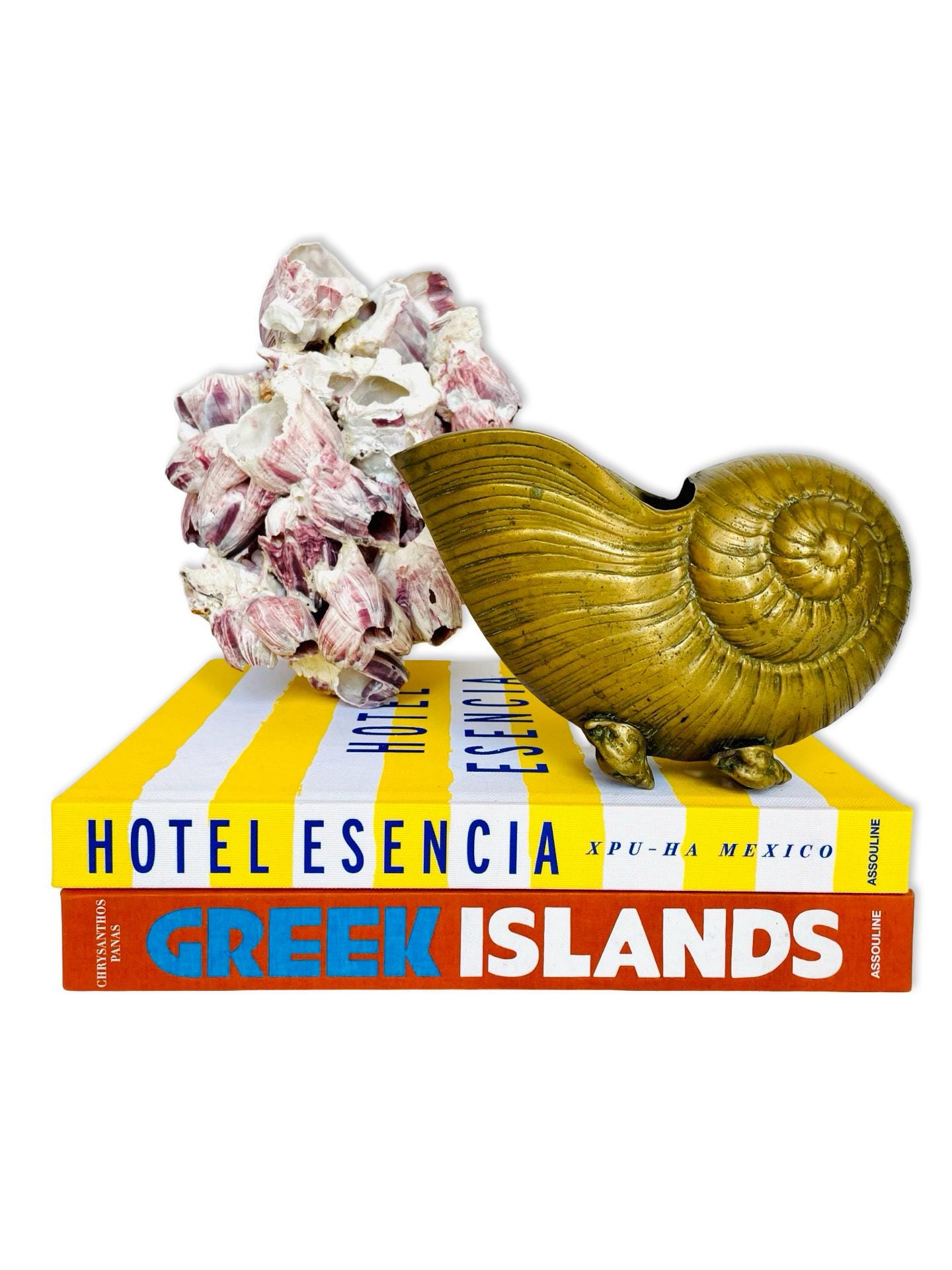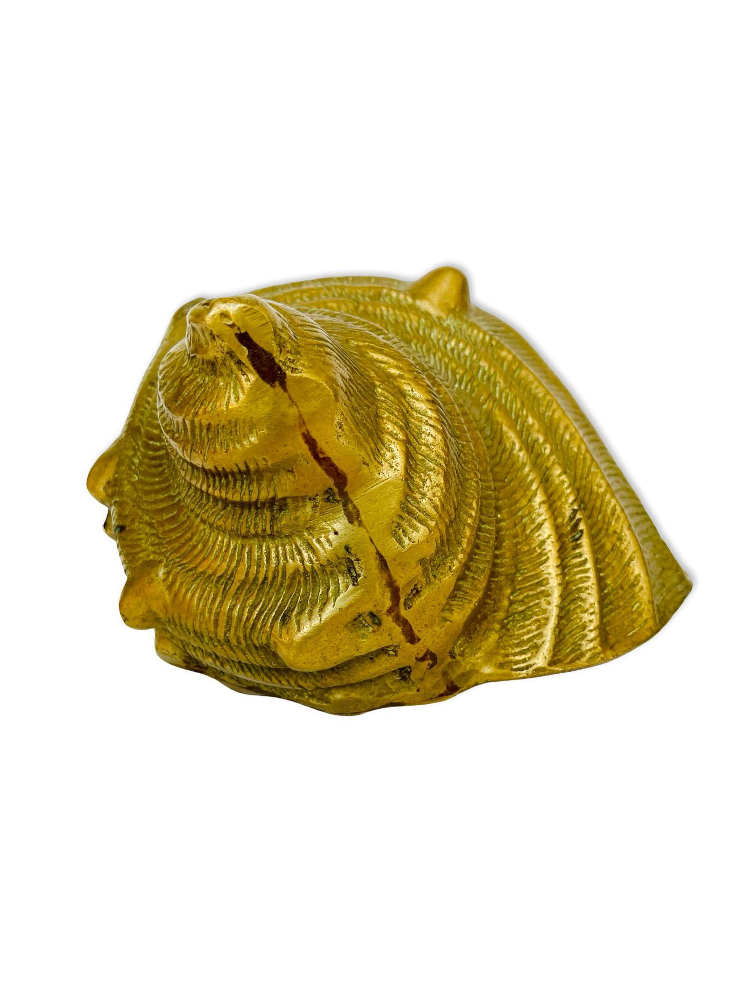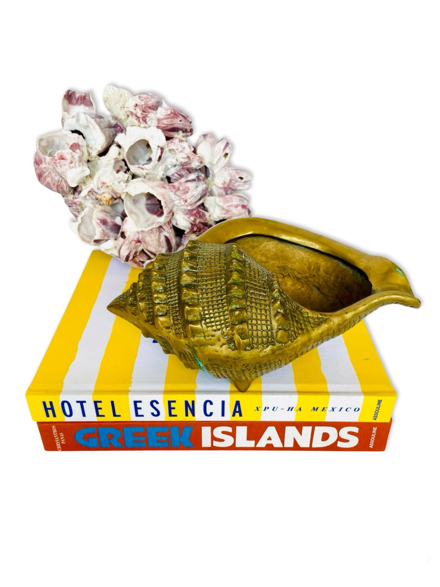 Three distinct oversized shell forms—a sculptural nautilus, a ridged clam-style vessel, and a textured conch—each with its own personality and patina. The warm brass tones paired with subtle verdigris accents give them that perfectly aged, found-on-a-treasure-hunt feel.