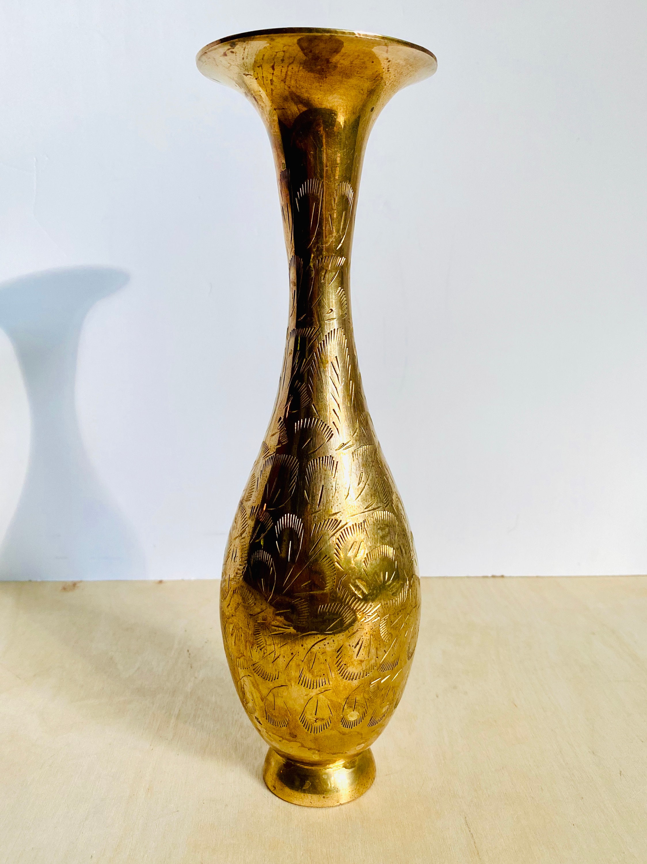 This gorgeous Indian etched brass vase is a classic beauty. It looks gorgeous displayed in your home on its own or makes a great home for an arrangement of fresh or dried flowers.